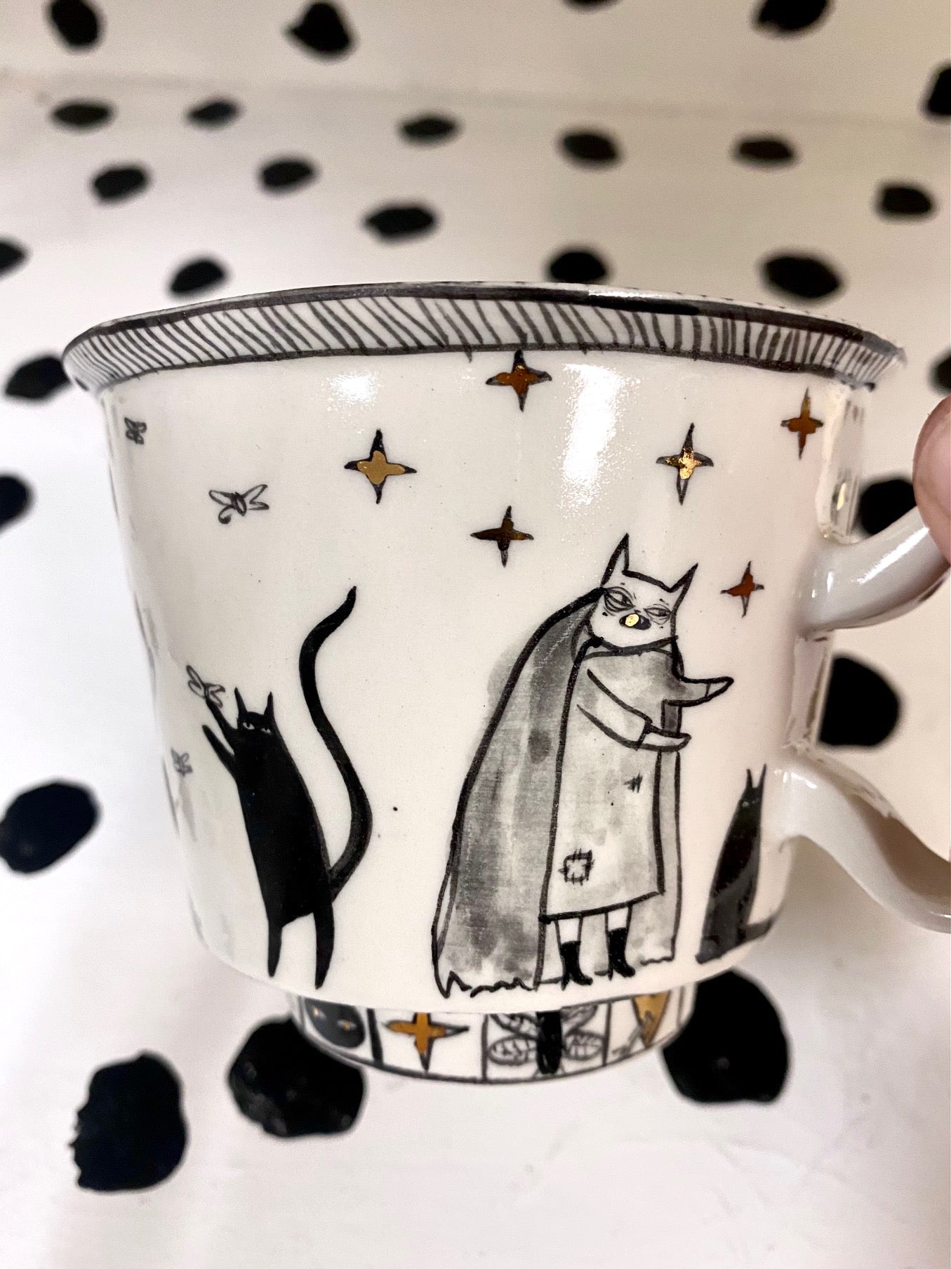 Handmade and hand painted porcelain ceramic mug. Electric fired to cone 6, about 5'' tall x 3.25'' wide, holds about 12 ounces. This piece is NOT microwave and dishwasher safe due to the metallic gold luster.