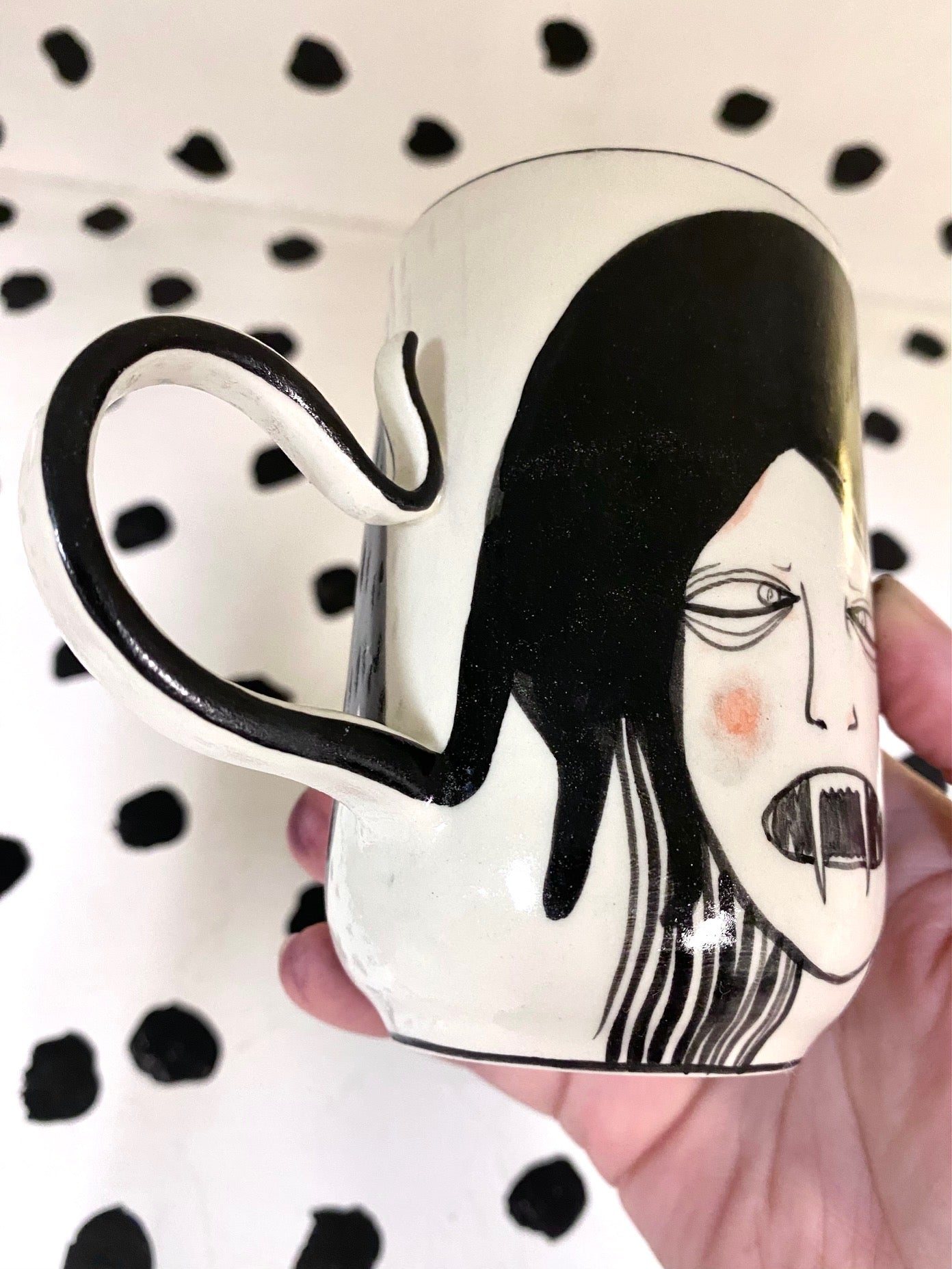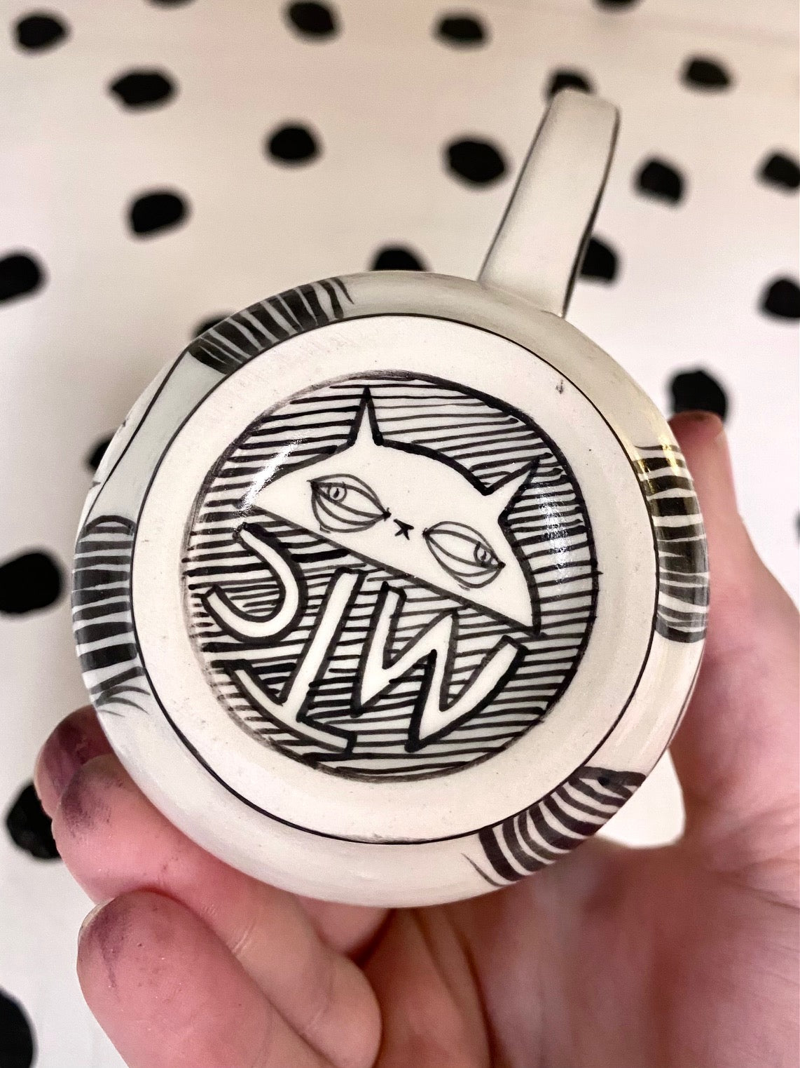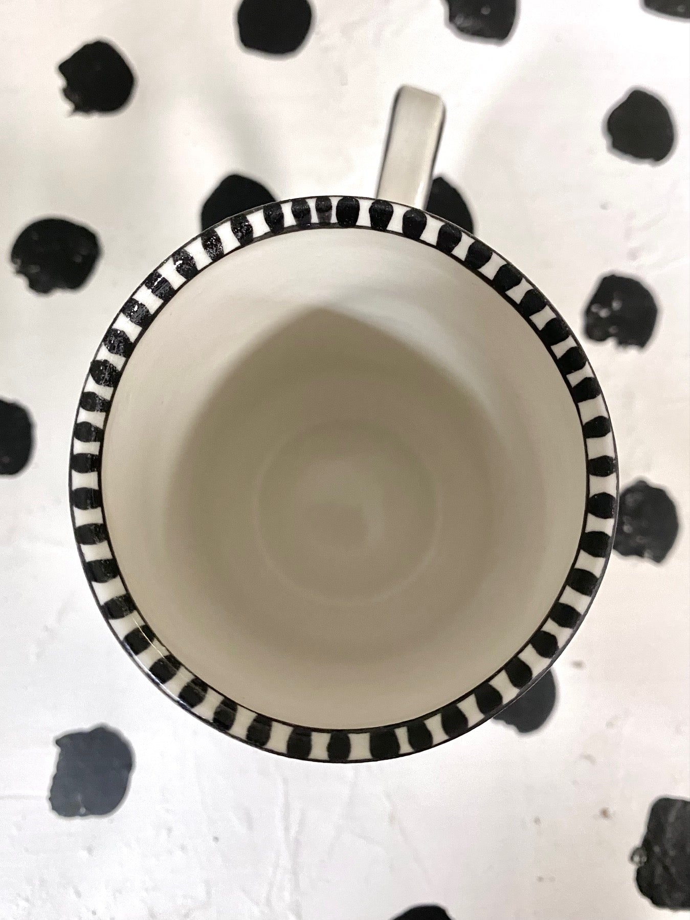 Handmade and hand painted porcelain ceramic mug. Electric fired to cone 6, about 4'' tall x 3'' wide, holds about 9 ounces. This piece is microwave and dishwasher safe but hand washing is recommended.