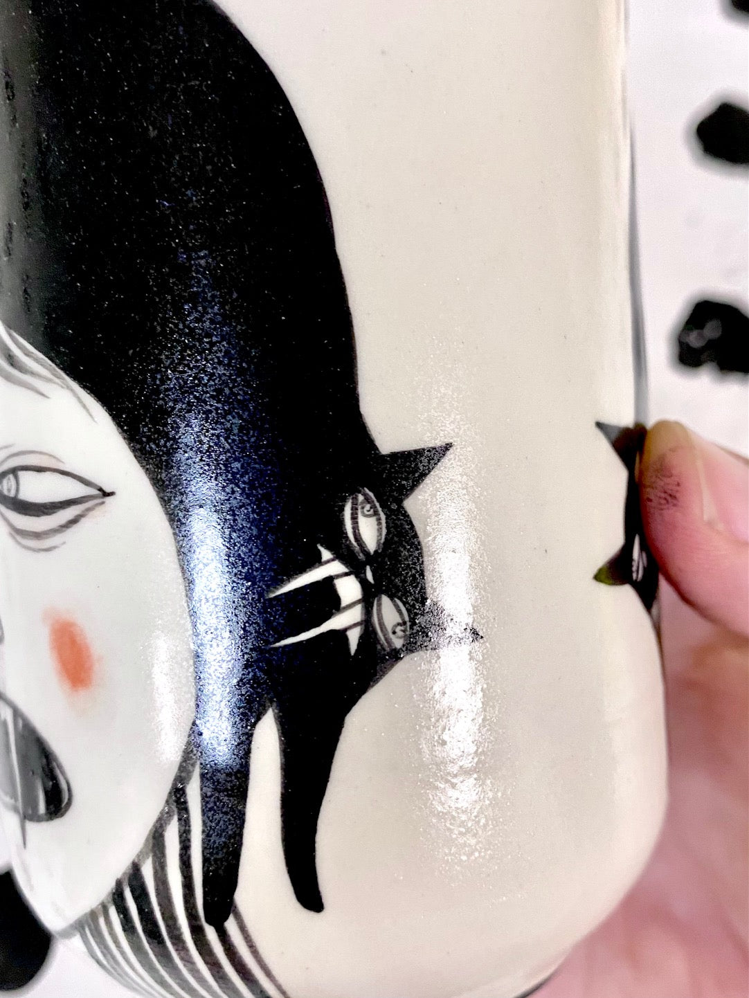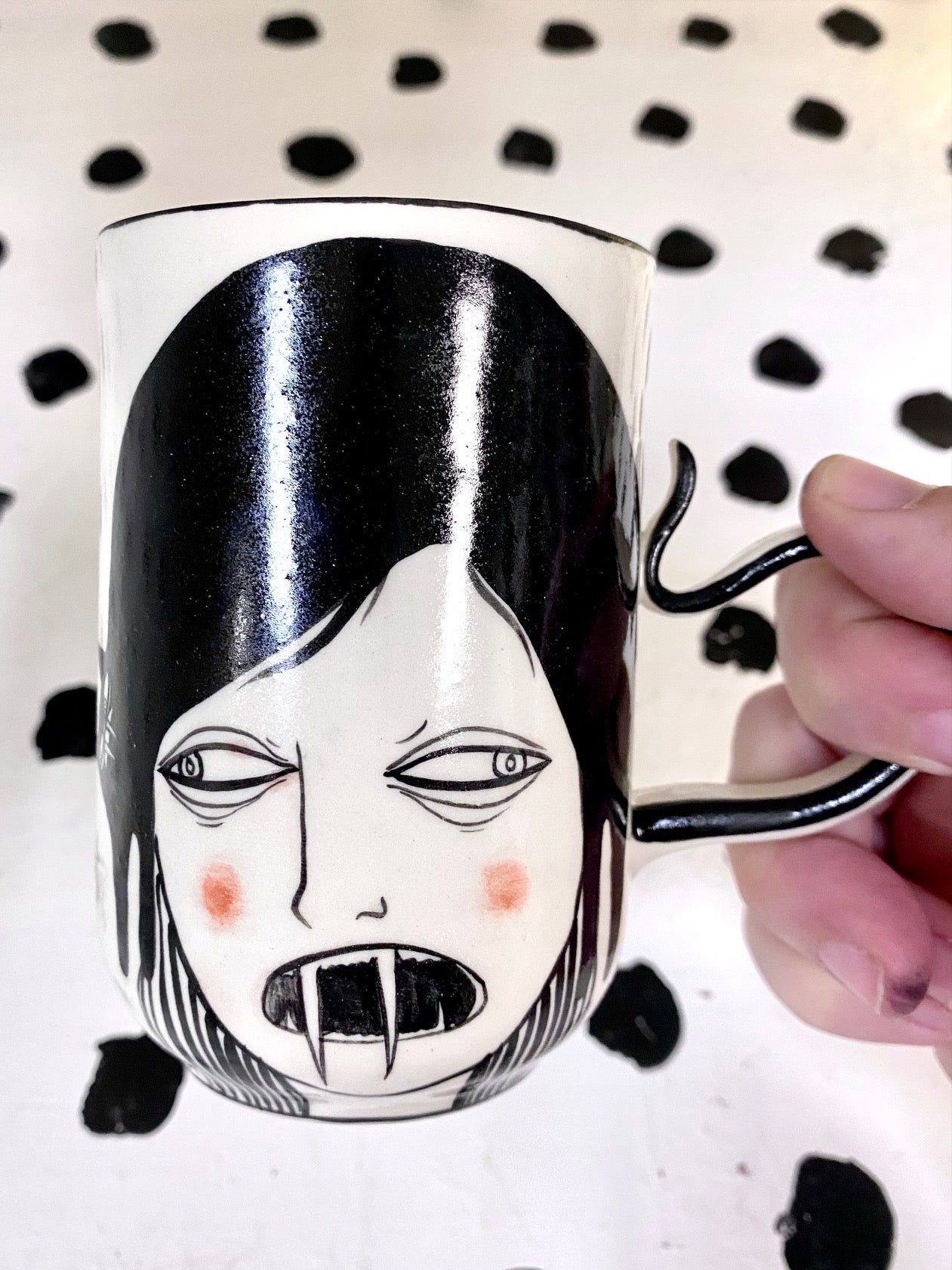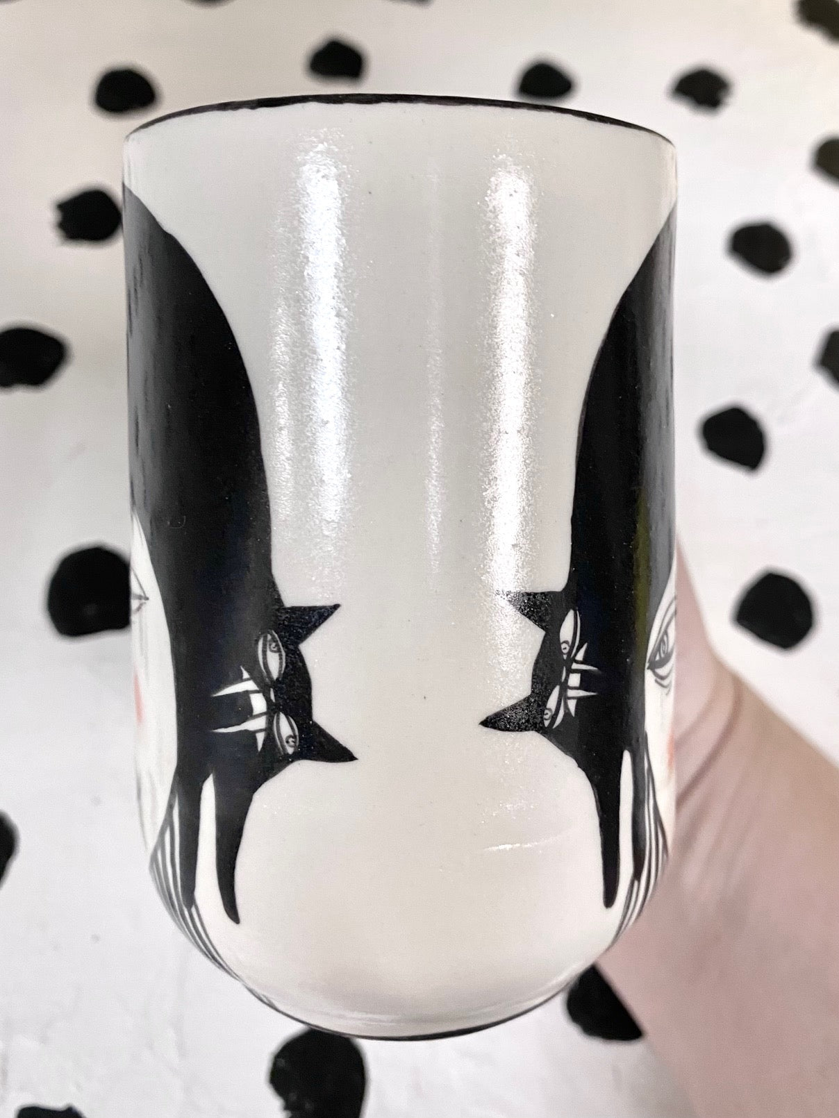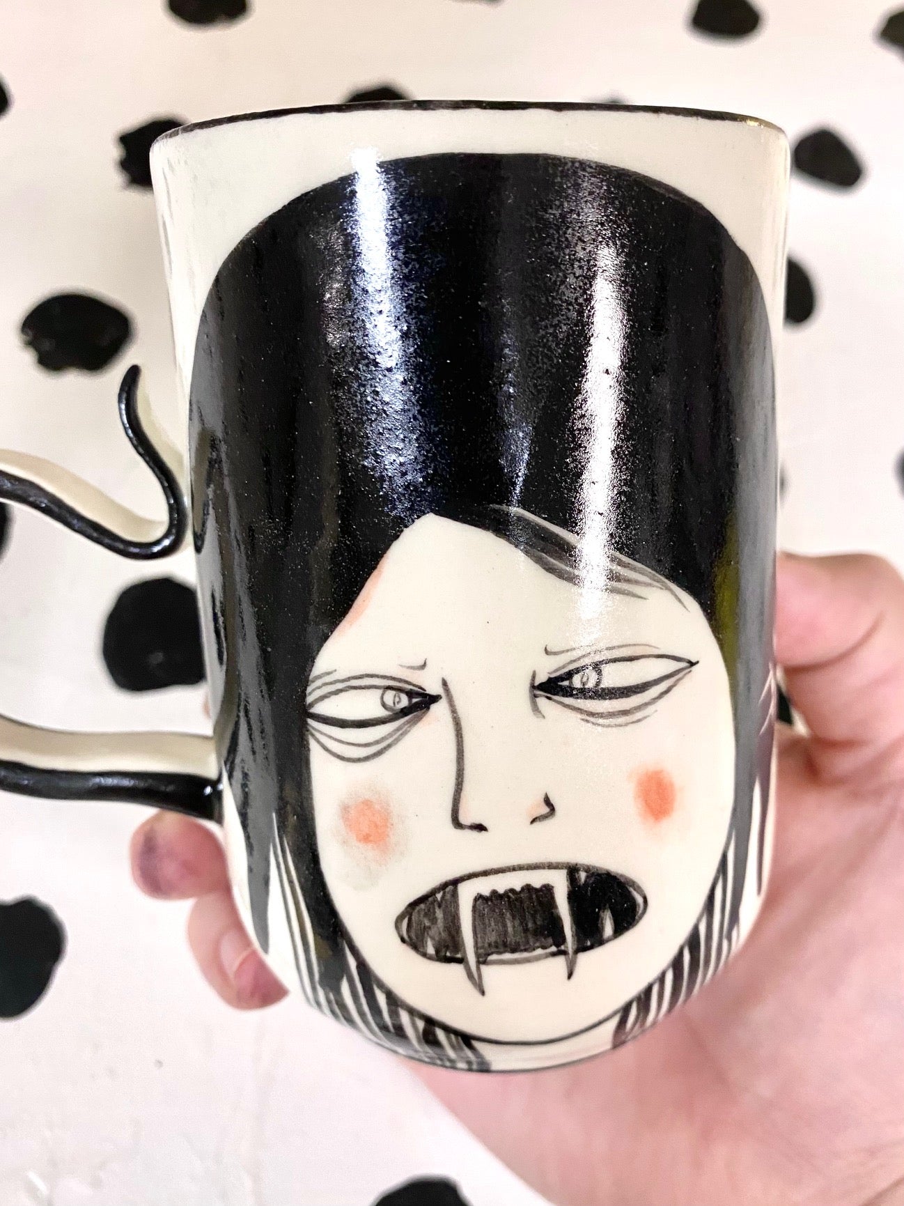 Handmade and hand painted porcelain ceramic mug. Electric fired to cone 6, about 4'' tall x 3'' wide, holds about 9 ounces. This piece is microwave and dishwasher safe but hand washing is recommended.