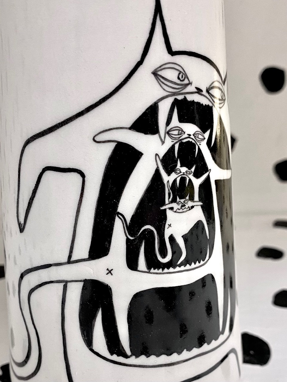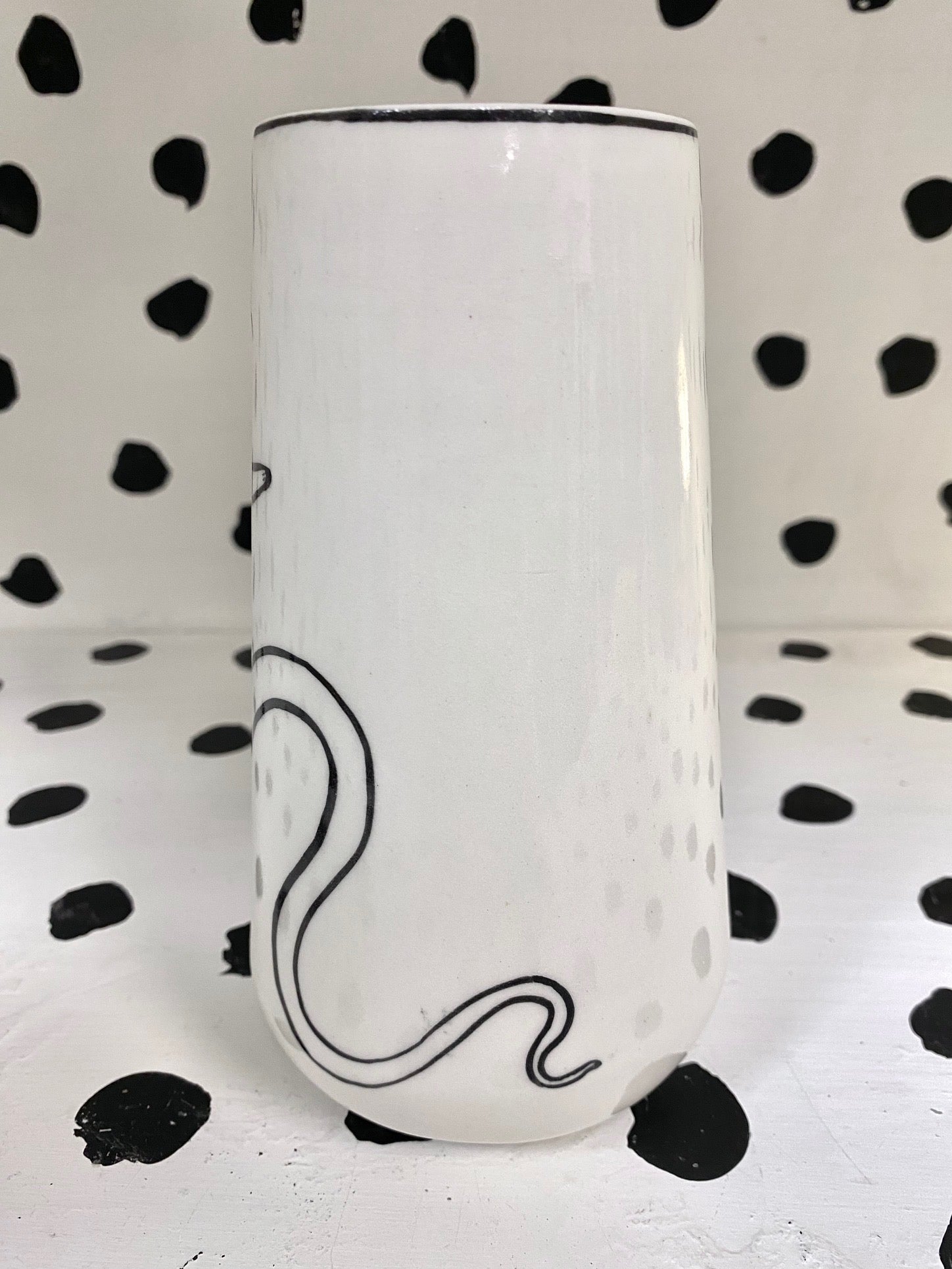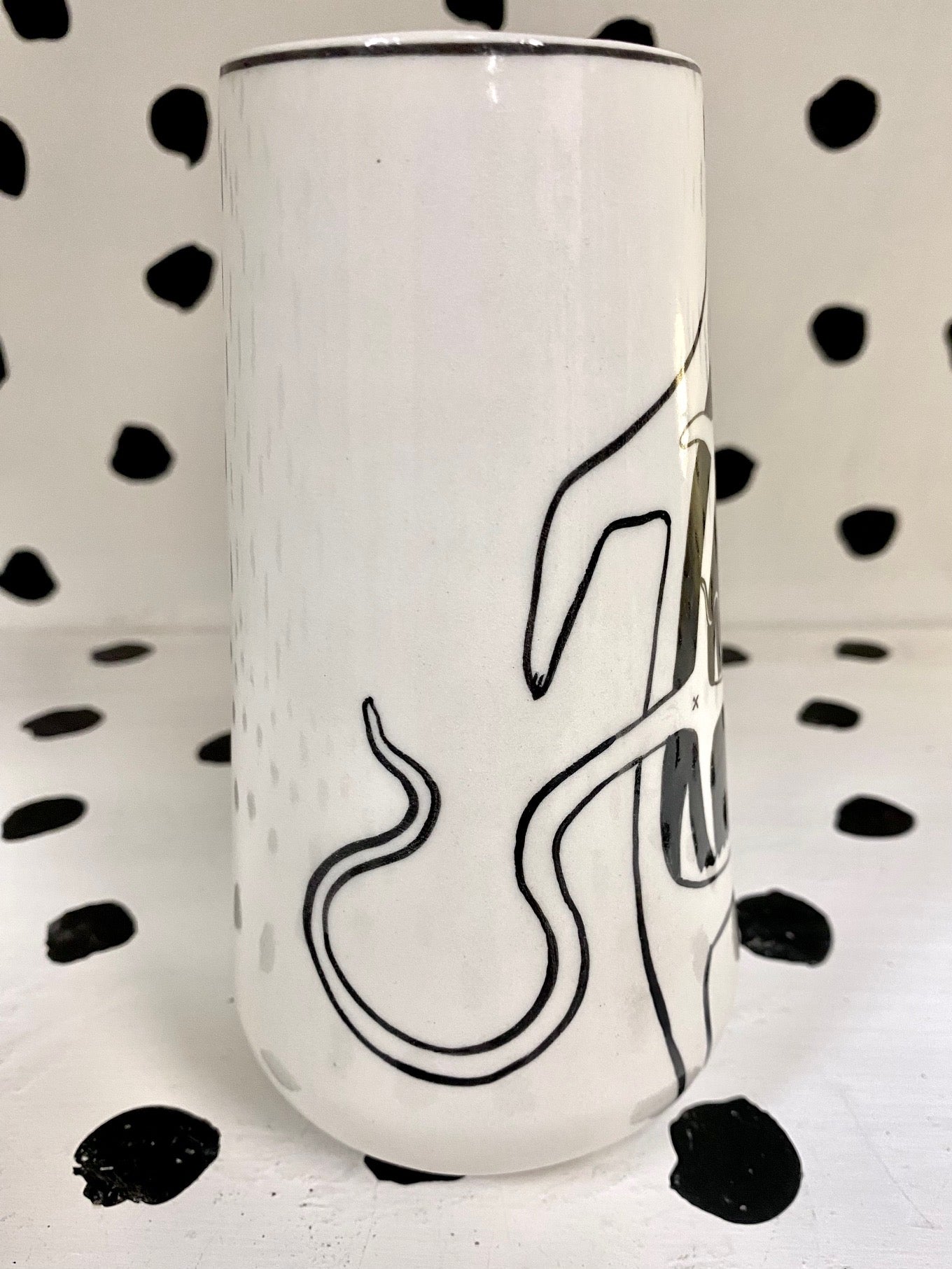 Handmade and hand painted porcelain ceramic mug. Electric fired to cone 6, about 7'' tall x 3.25'' wide, holds about 18 ounces. This piece is microwave and dishwasher safe but hand washing is recommended.