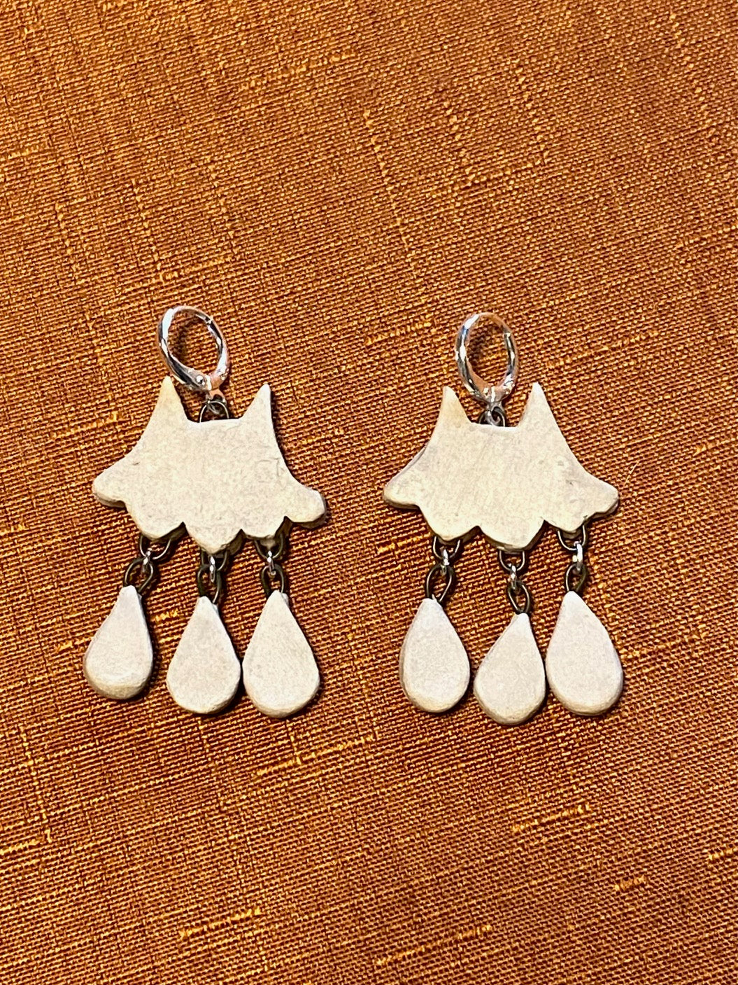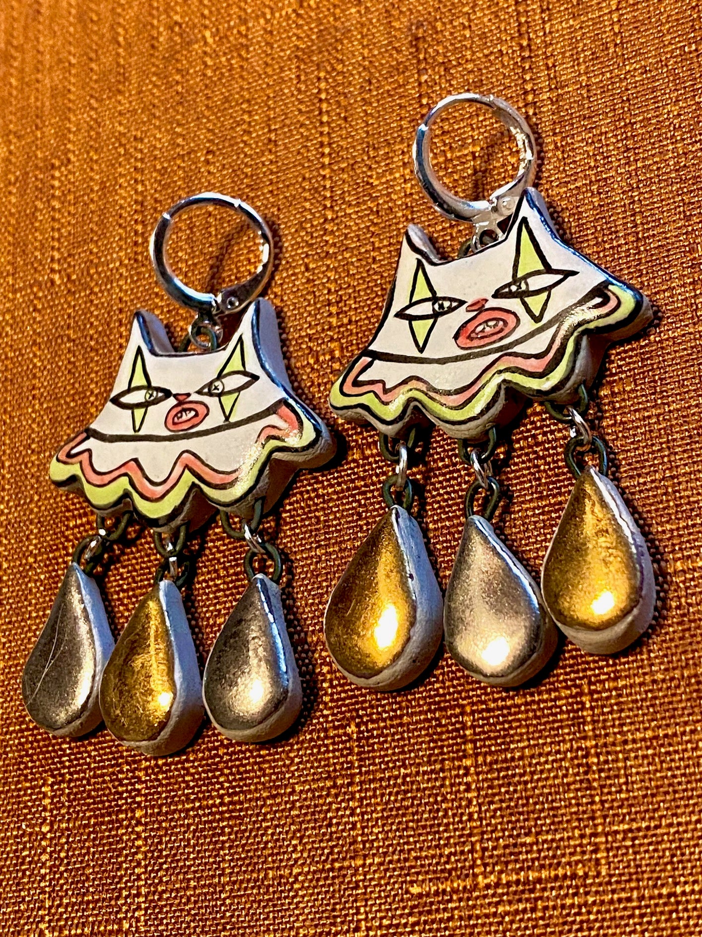 Handmade stoneware earrings with majolica and luster decorations. Finished with stainless steel nickel free hoops.
