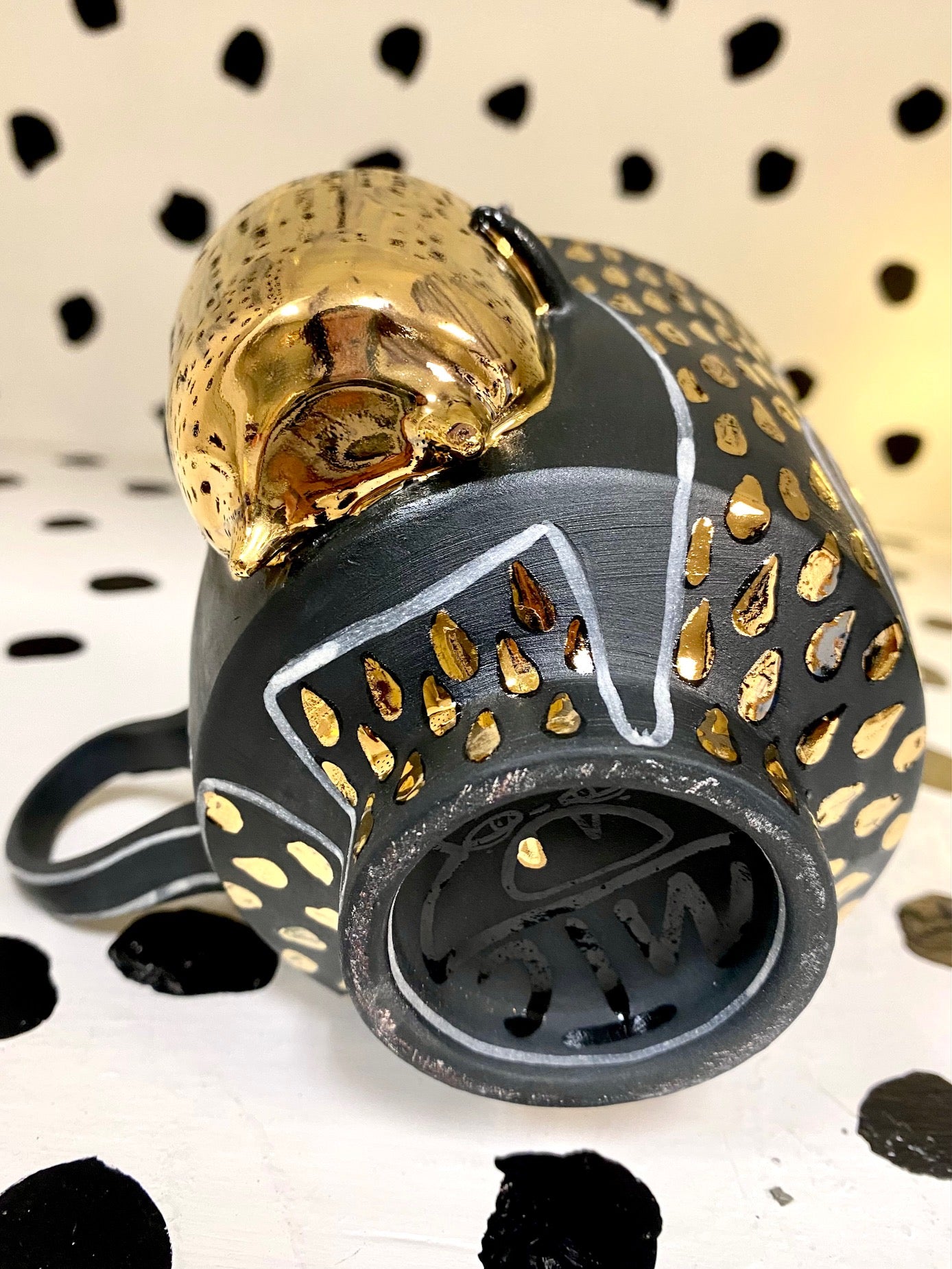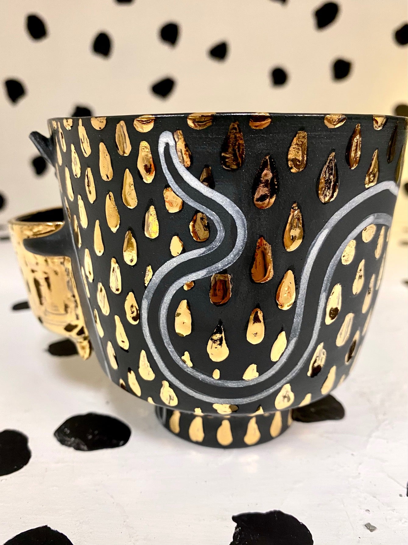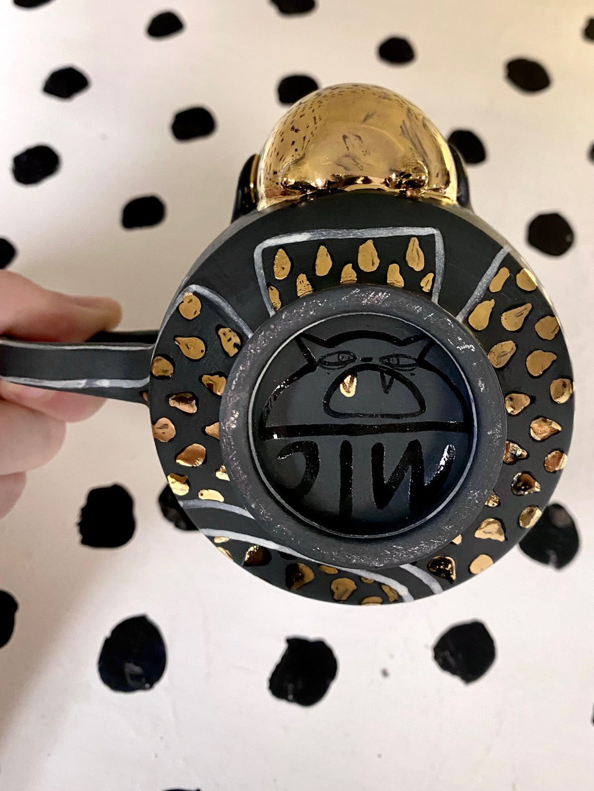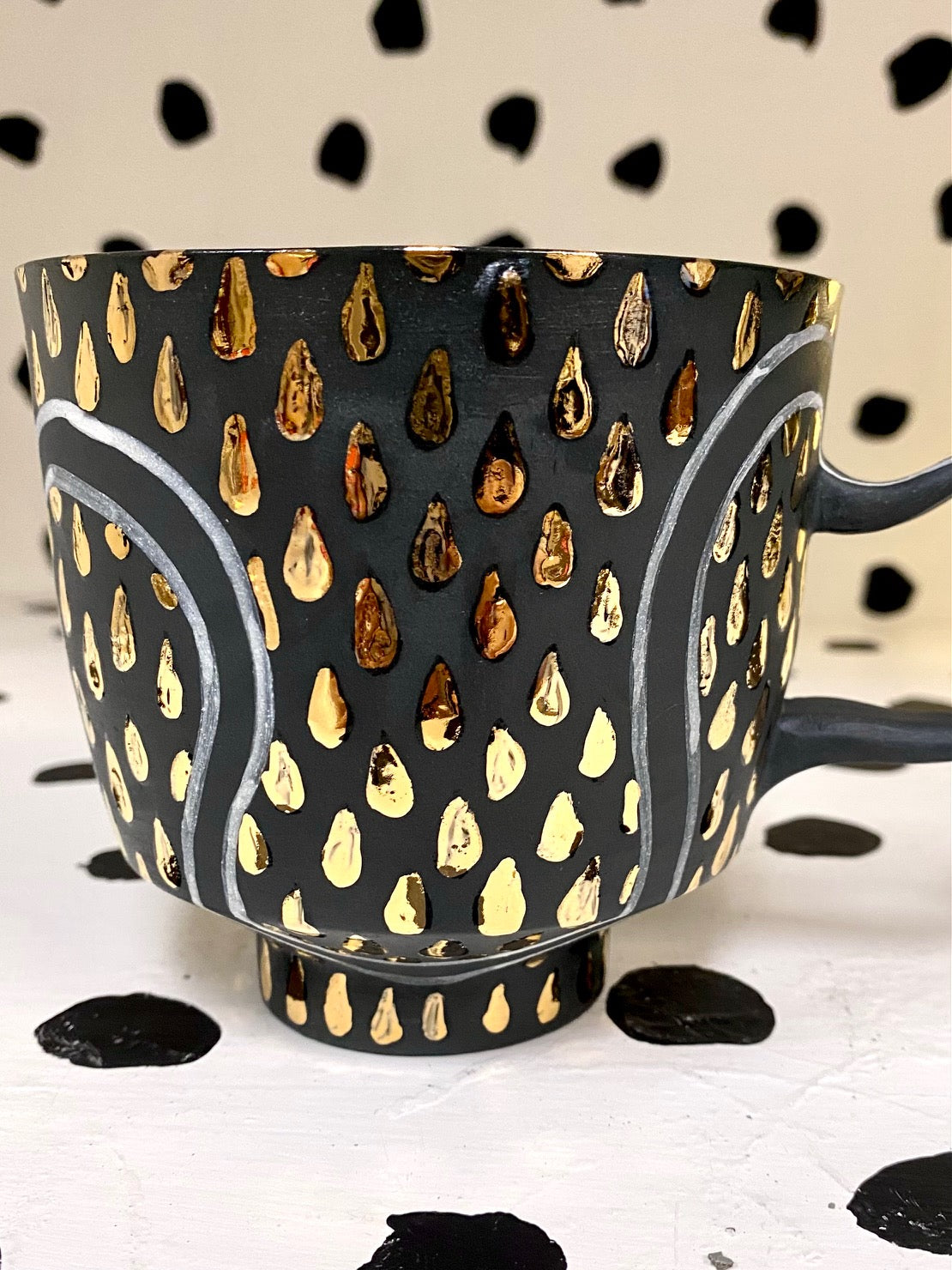 Handmade and hand painted porcelain ceramic mug. Electric fired to cone 6, about 4.5'' tall x 3.25'' wide, holds about 14 ounces. This piece is NOT dishwasher and microwave safe due to the metallic gold luster, handwashing recommended.