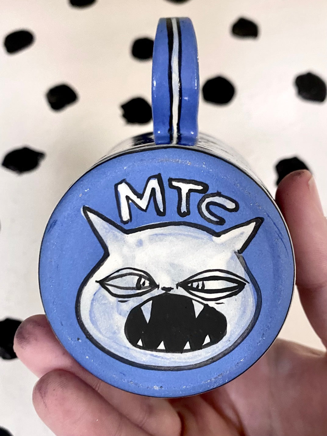 Handmade and hand painted porcelain ceramic mug. Electric fired to cone 6, about 3'' tall x 3'' wide, holds about 8 ounces.  Microwave and dishwasher safe but hand washing is recommended.