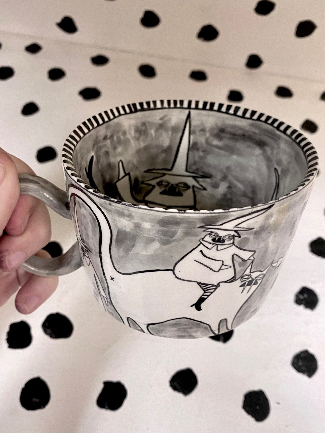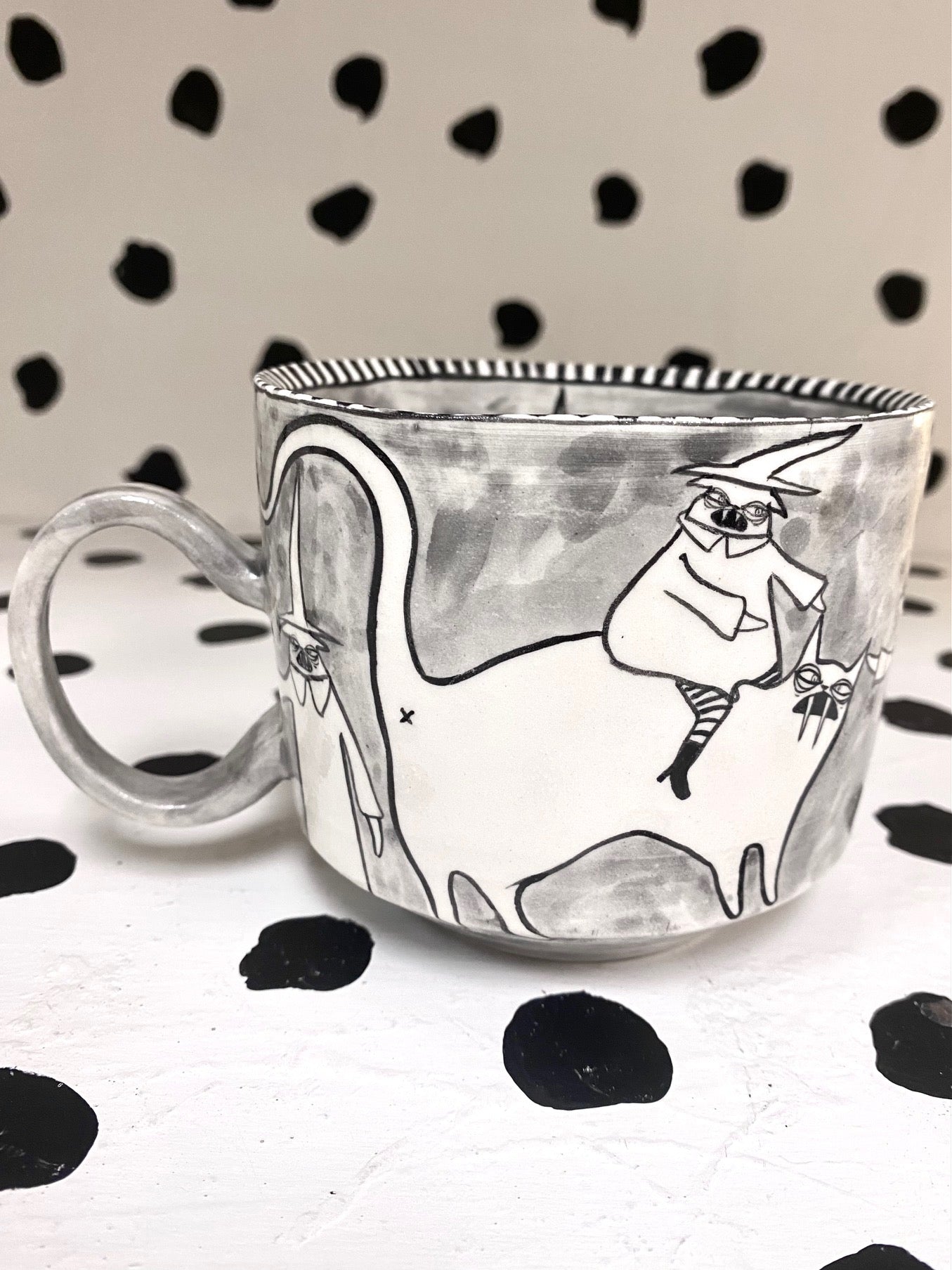 Handmade and hand painted porcelain ceramic mug. Electric fired to cone 6, about 7'' tall x 3.25'' wide, holds about 18 ounces. This piece is microwave and dishwasher safe but hand washing is recommended for longevity of use.