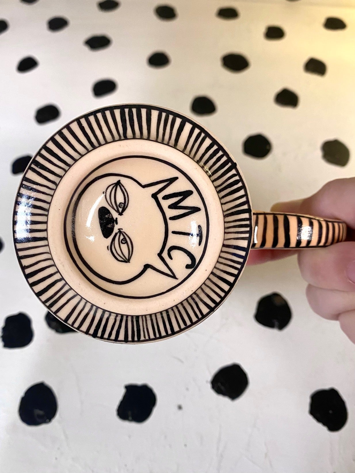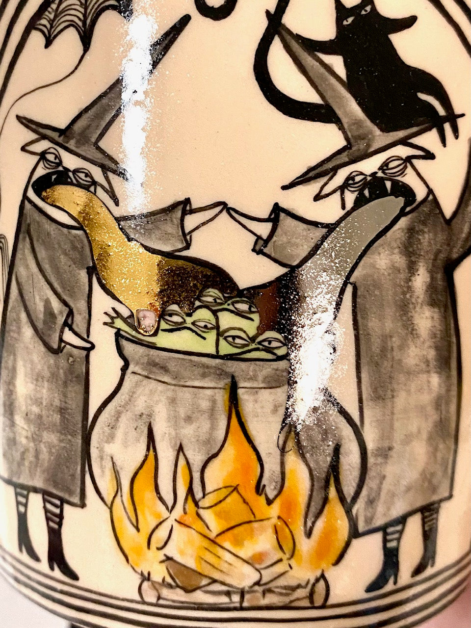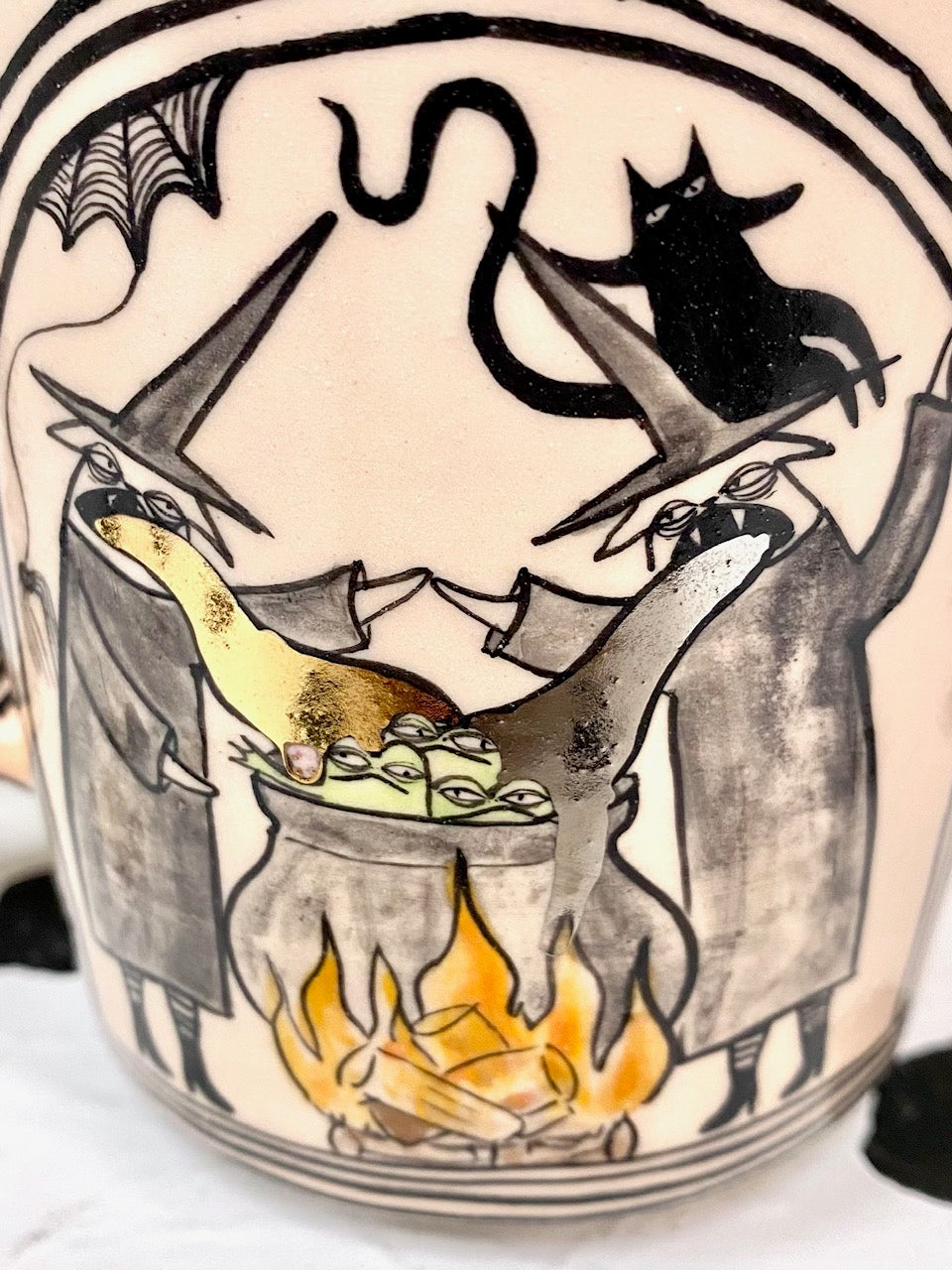 Handmade and hand painted porcelain ceramic mug. Electric fired to cone 6, about 5'' tall x 4'' wide, holds about 12. This piece is NOT microwave and dishwasher safe due to the metallic gold luster, hand washing luster areas gently. This piece has both gold and silver luster.