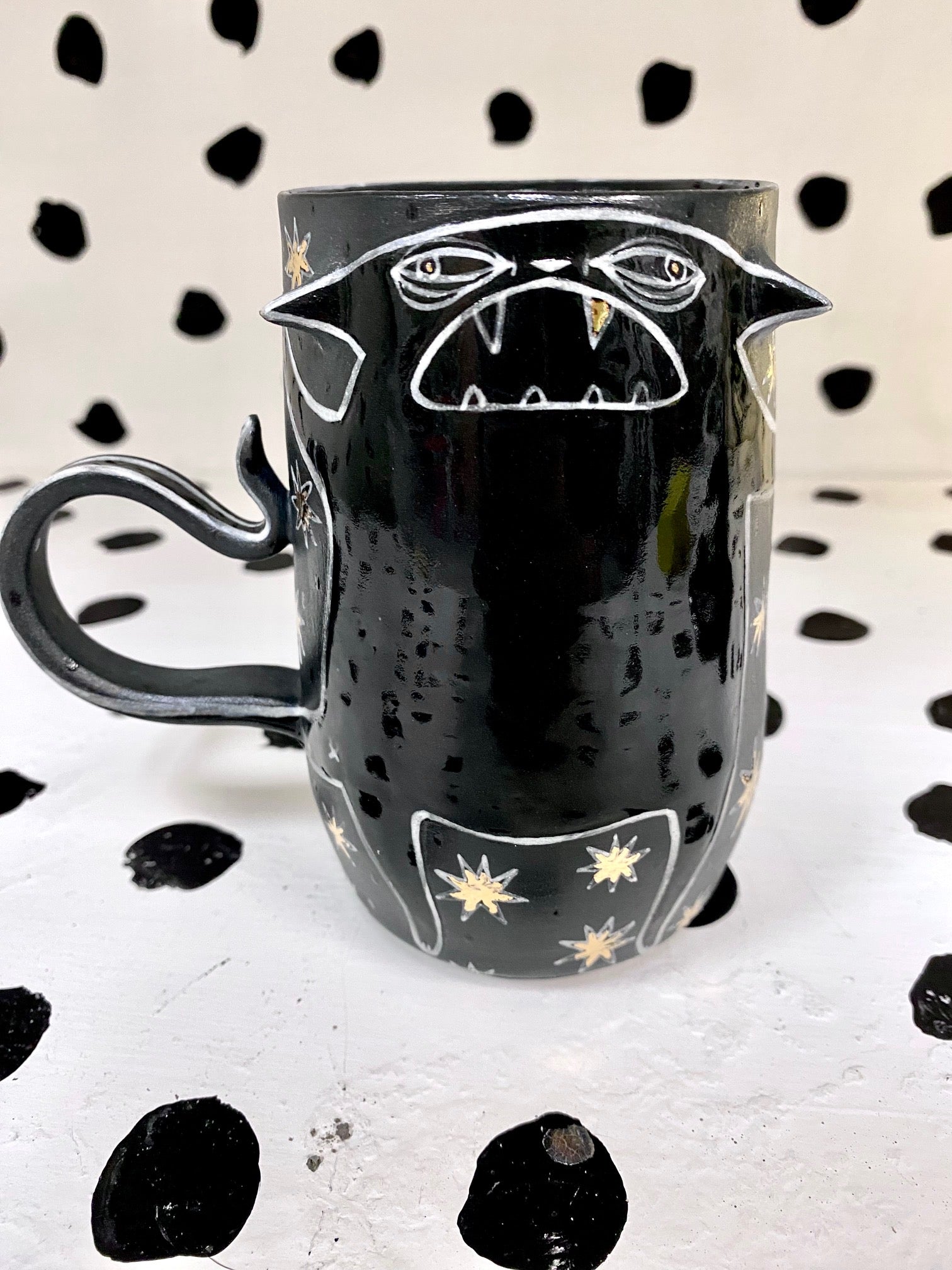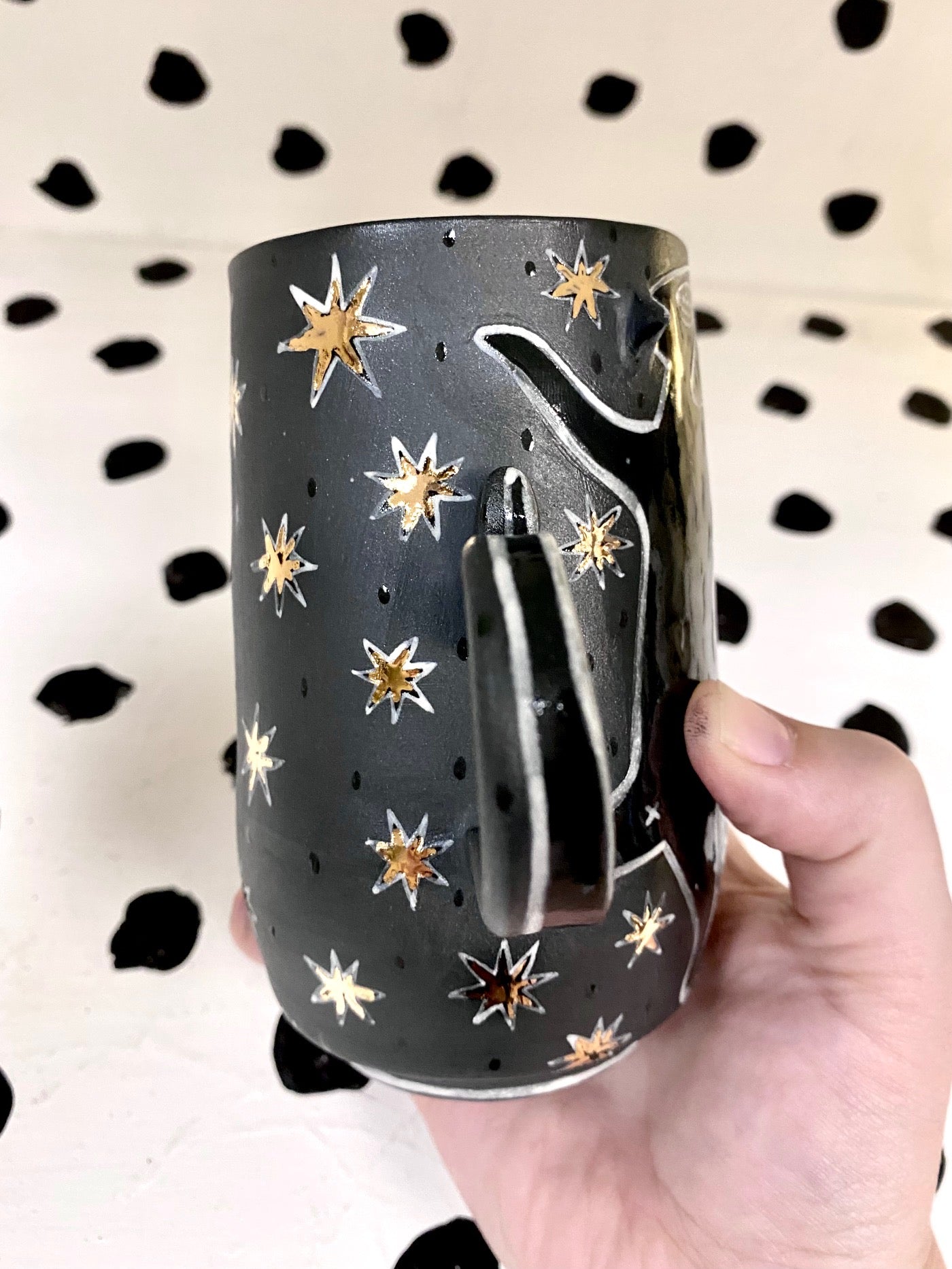 Handmade and hand painted porcelain ceramic mug. Electric fired to cone 6, mug isabout 4.5'' tall x 3.25'' wide, holds about 13 ounces. Lid is about 4.5''x4. This Piece is NOT microwave or dishwasher safe due to the metallic gold luster.