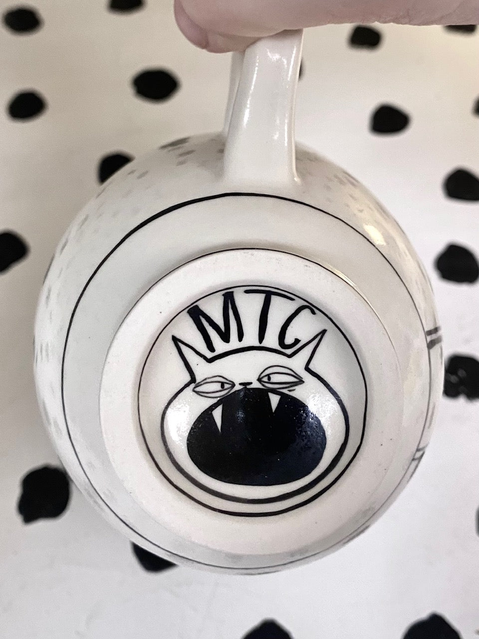 Handmade and hand painted porcelain ceramic mug. Electric fired to cone 6, about 4.5'' tall x 3.25'' wide, holds about 13 ounces. Dishwasher and microwave safe.