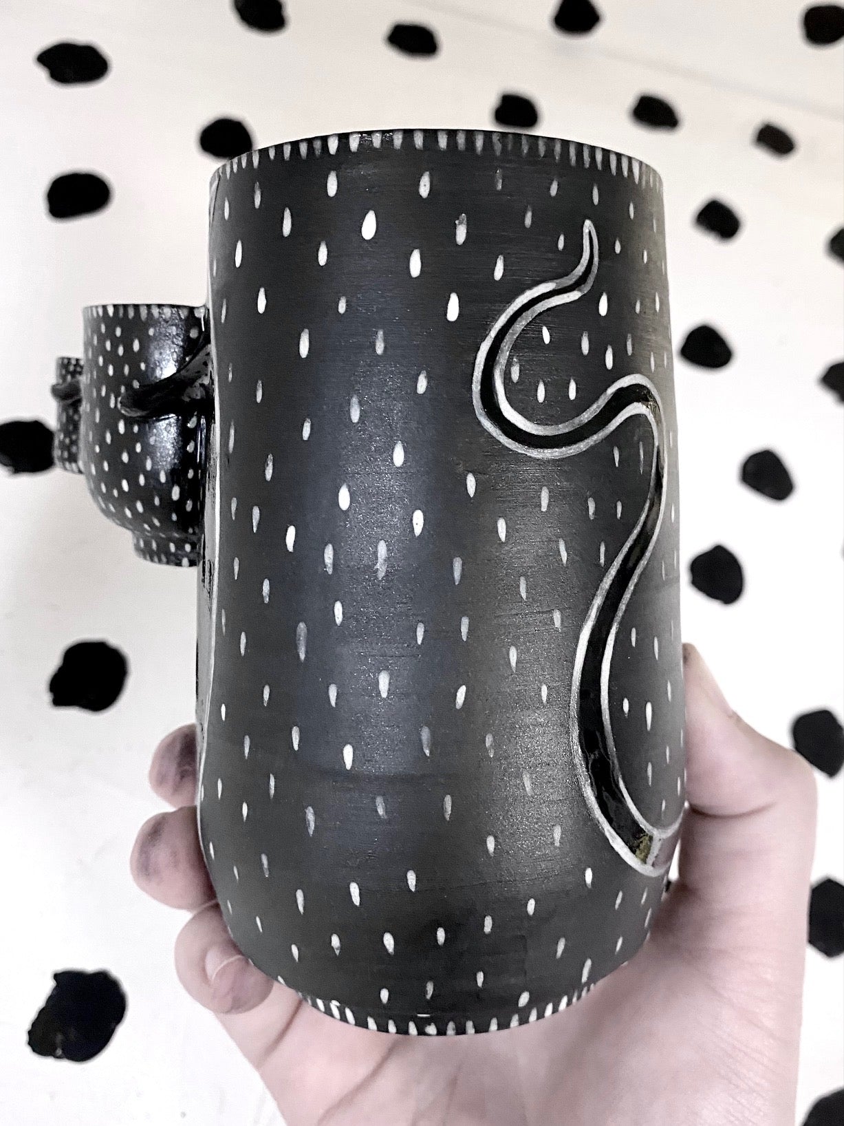 Handmade and hand painted porcelain ceramic mug. Electric fired to cone 6, about 4.5'' tall x 3.25'' wide, holds about 13 ounces. Dishwasher and  microwave safe but handwashing recommended for longevity.