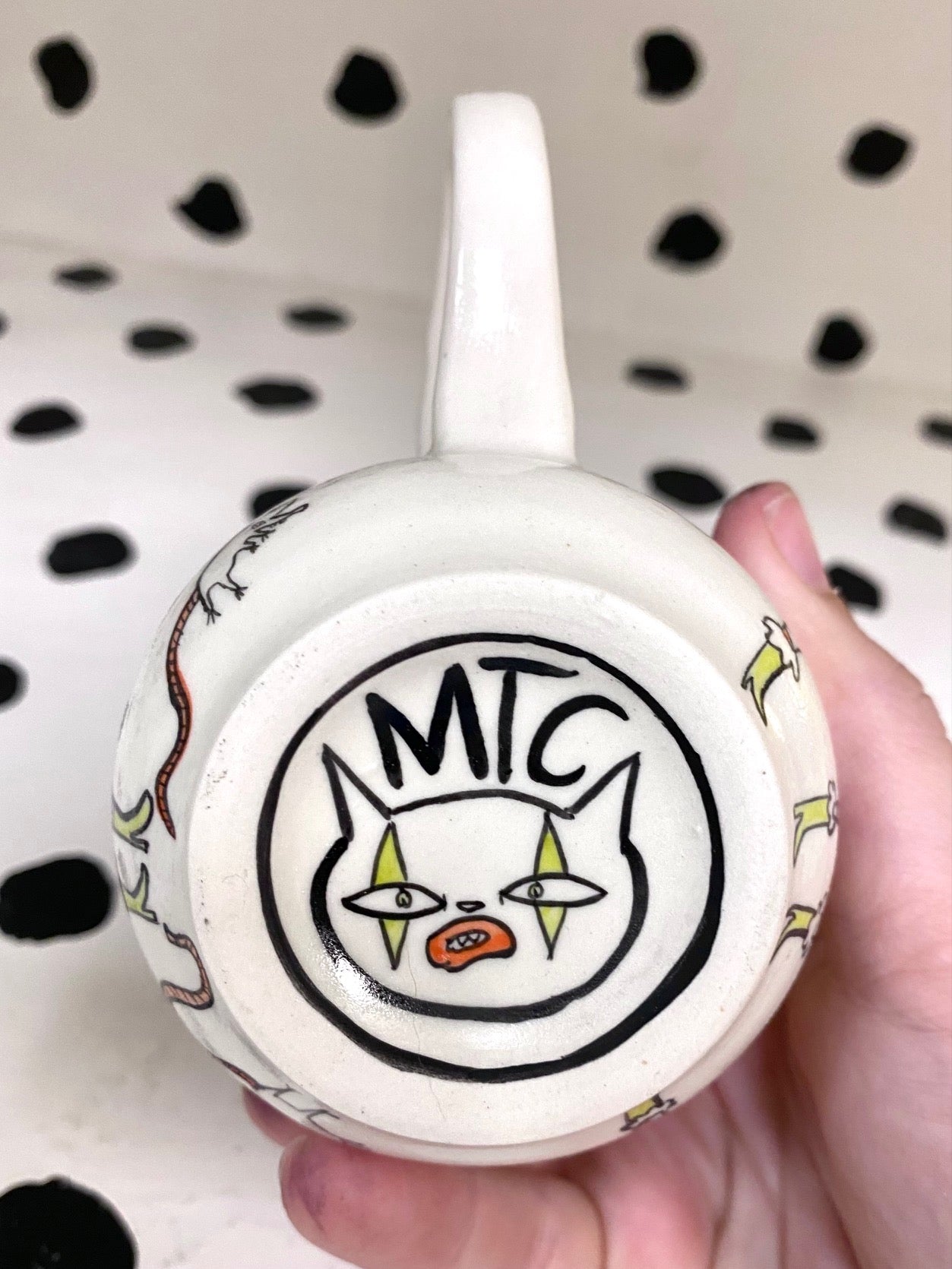 Handmade and hand painted porcelain ceramic mug. Electric fired to cone 6, about 4'' tall x 3'' wide, holds about 9 ounces. This piece is microwave and dishwasher safe but hand washing is recommended.