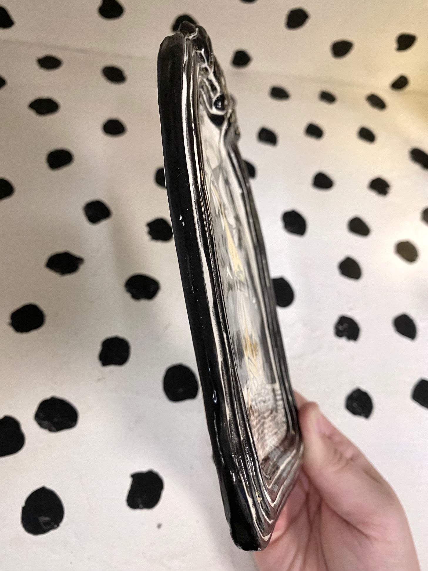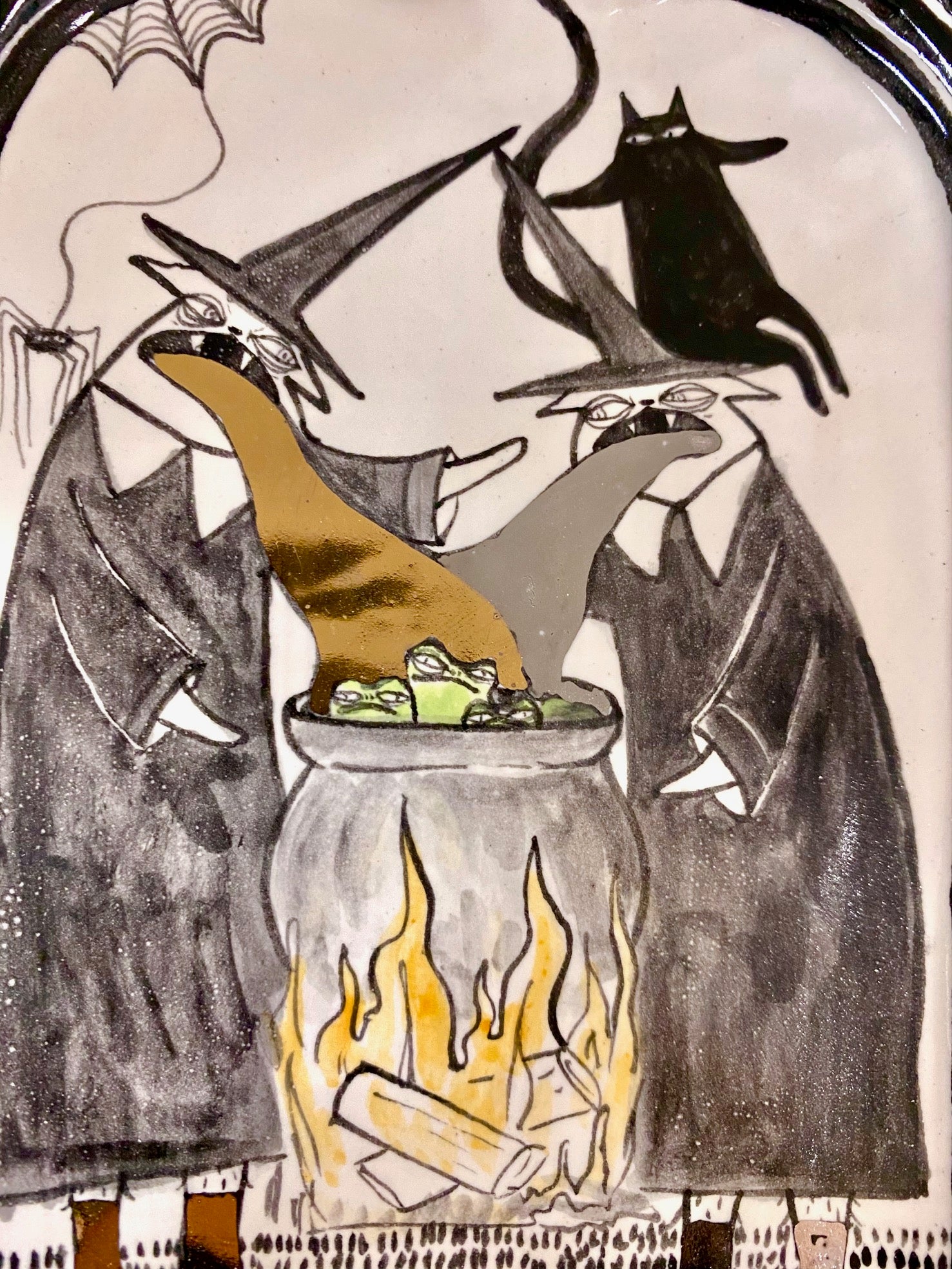 Handmade and hand painted majolica wall hanging Electric fired to cone 04, about 7.5'' tall by 5.5 inches wide. Has glued hardware on back for hanging.