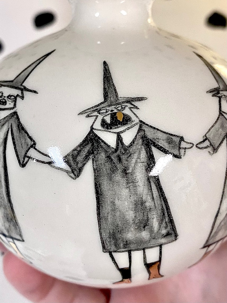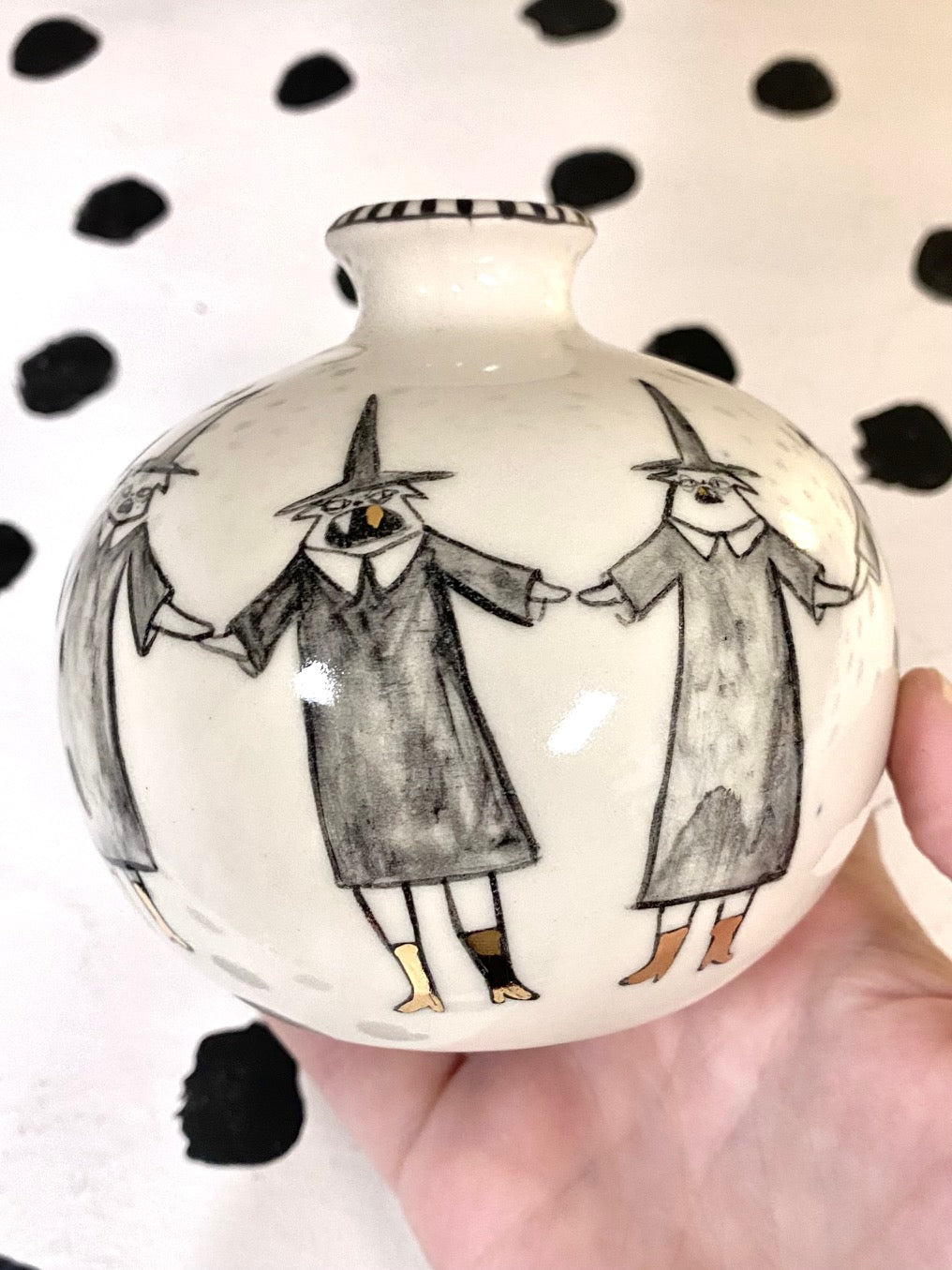 Porcelain vase, electric fired to cone 6. About 4 inches wide by 4 inches tall.