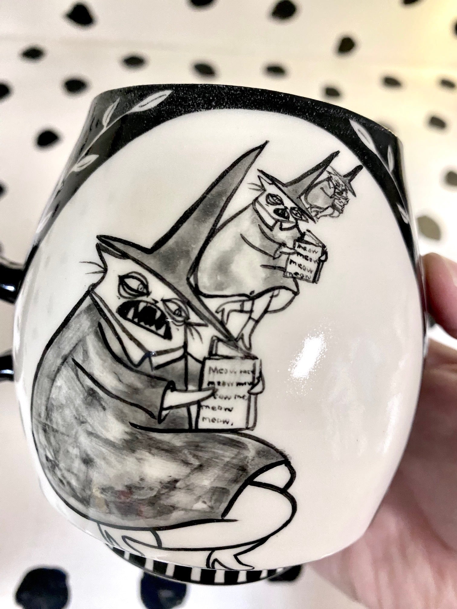 Handmade and hand painted porcelain ceramic mug. Electric fired to cone 6, about 4.5'' tall x 3.25'' wide, holds about 14 ounces. Dishwasher and microwave safe but handwashing recommended
