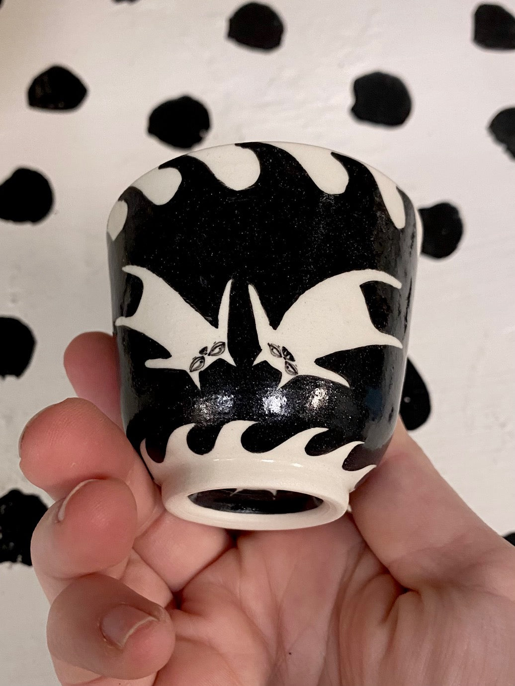 Handmade and hand painted porcelain ceramic mug. Electric fired to cone 6, about 6.5'' tall x 3.25'' wide, holds about 16 ounces, cup holds about 4 ounces. Microwave and dishwasher safe but hand washing is recommended for longevity of use.