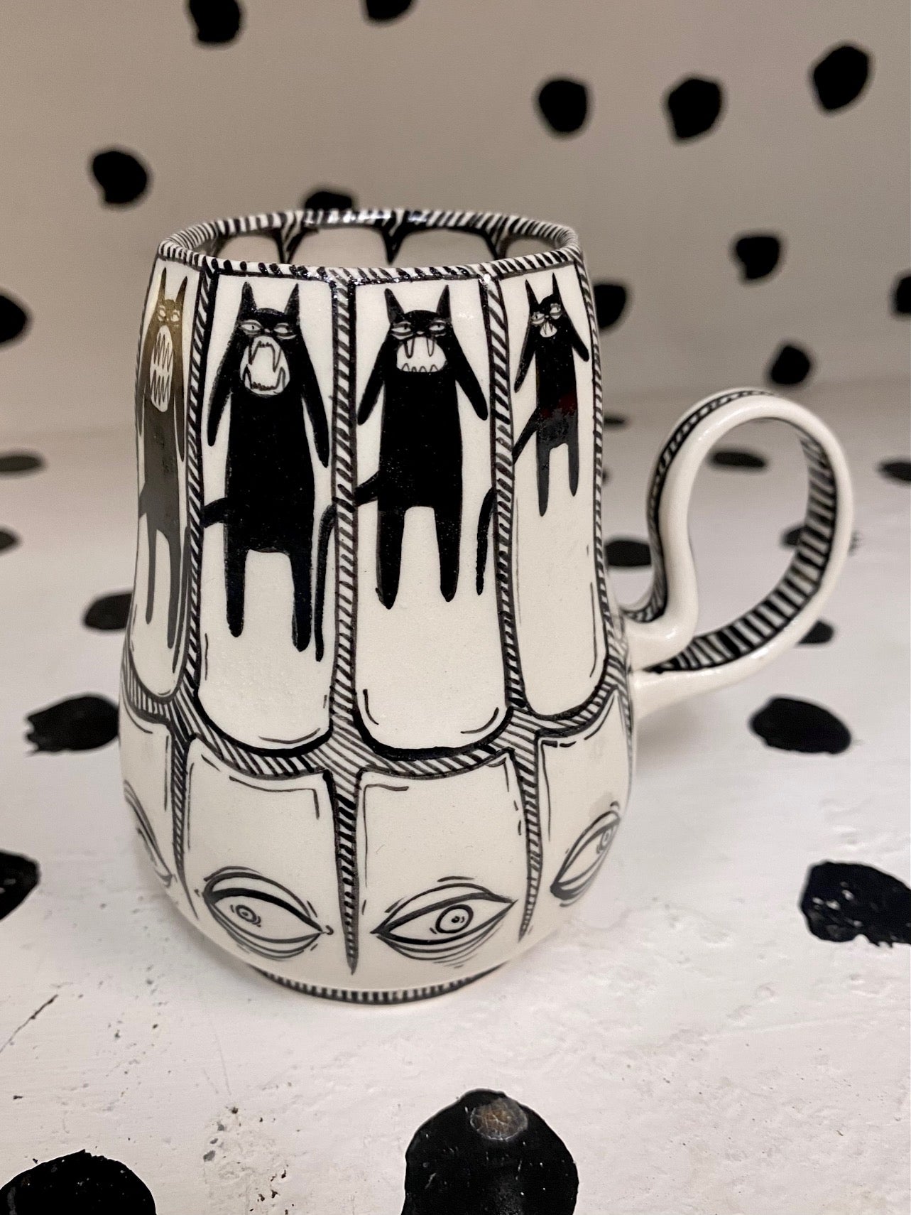 Handmade and hand painted porcelain ceramic mug. Electric fired to cone 6, about 4'' tall x 3.25'' wide, holds about 12 ounces.Microwave and dishwasher safe but handwashing is recommended for longevity of use.