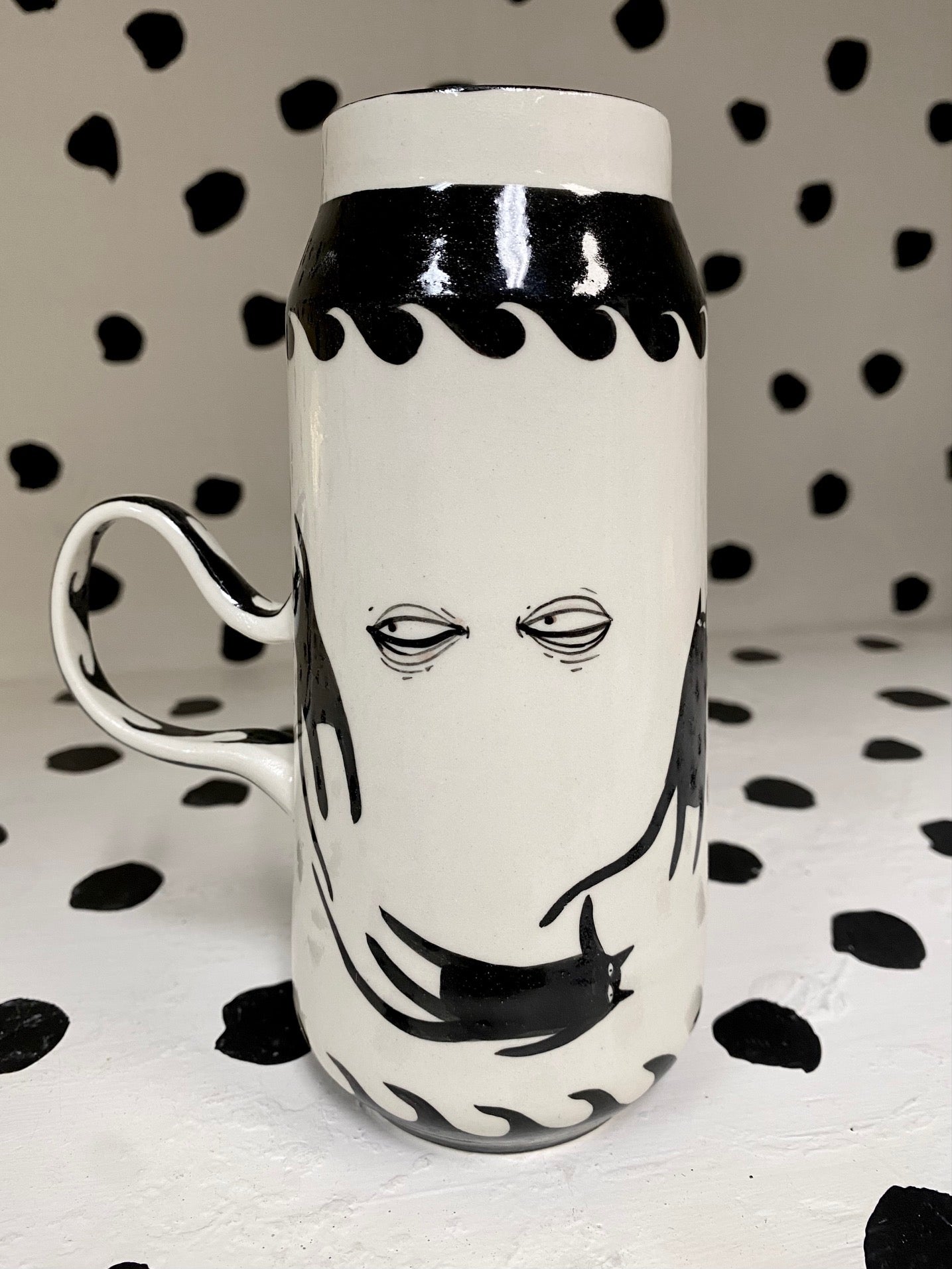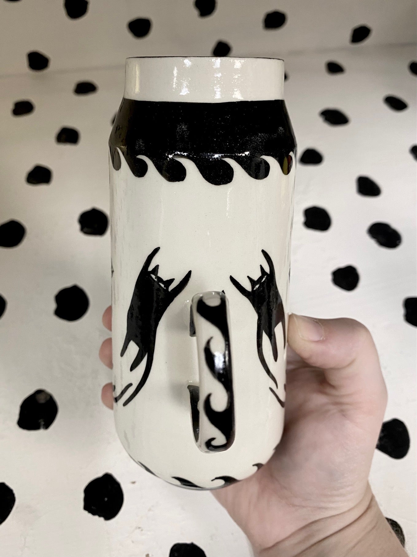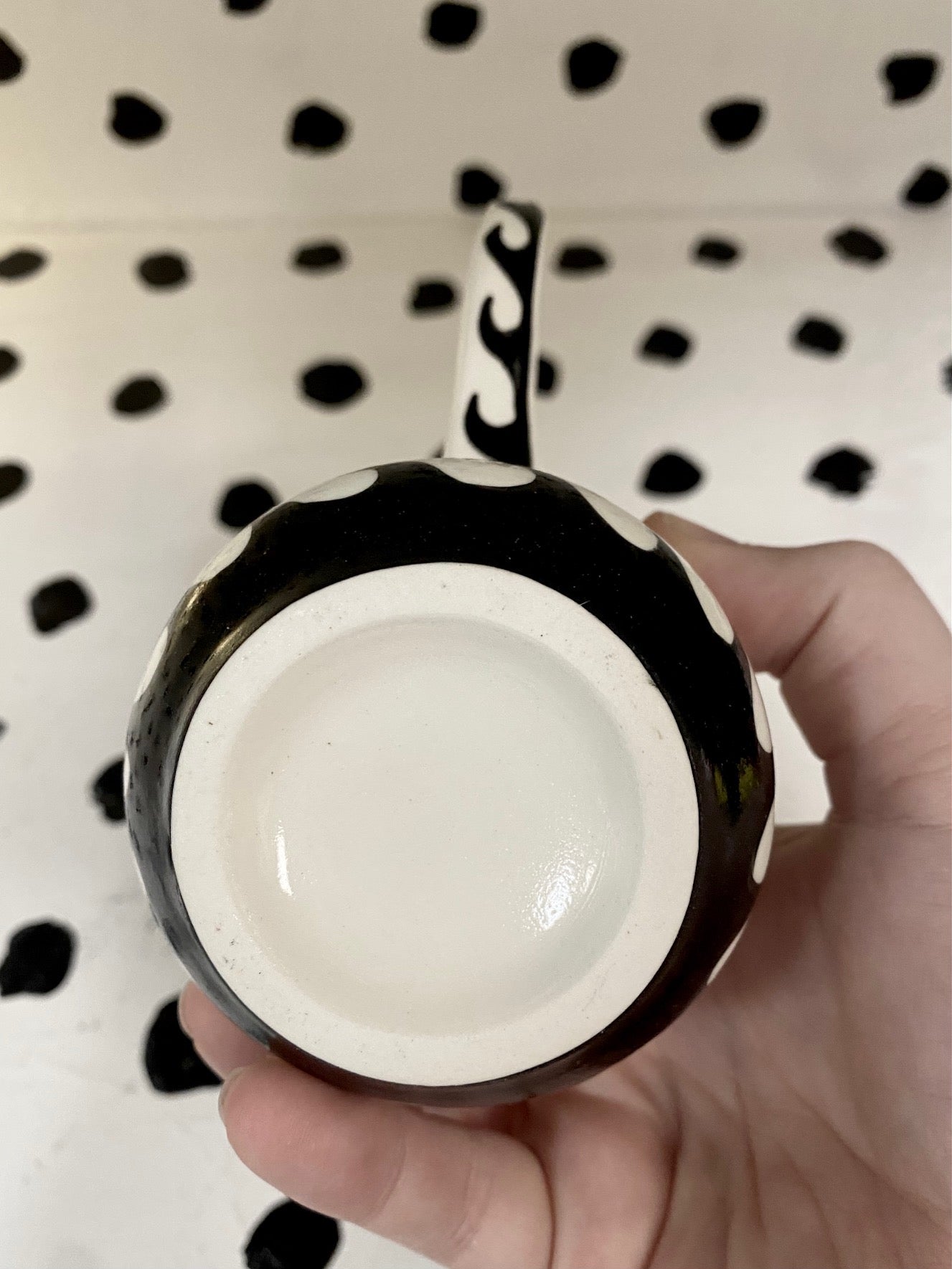 Handmade and hand painted porcelain ceramic mug. Electric fired to cone 6, about 6.5'' tall x 3.25'' wide, holds about 16 ounces. Microwave and dishwasher safe but hand washing is recommended for longevity of use.