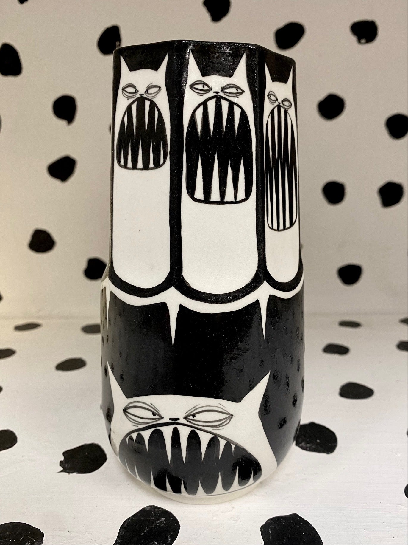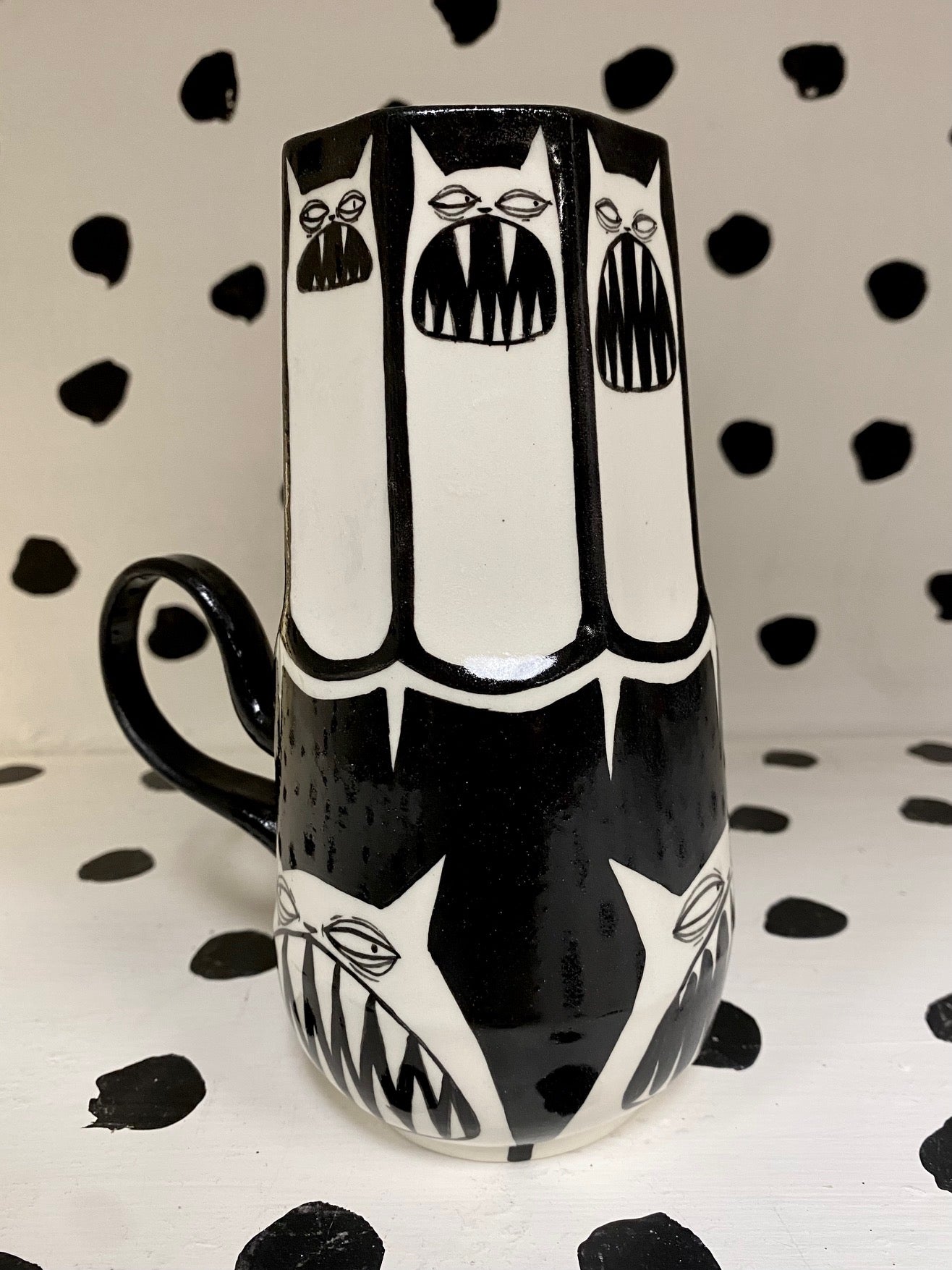 Handmade and hand painted porcelain ceramic mug. Electric fired to cone 6, about 7'' tall x 3.5'' wide, holds about 22 ounces. This piece is microwave and dishwasher safe but hand washing is recommended.