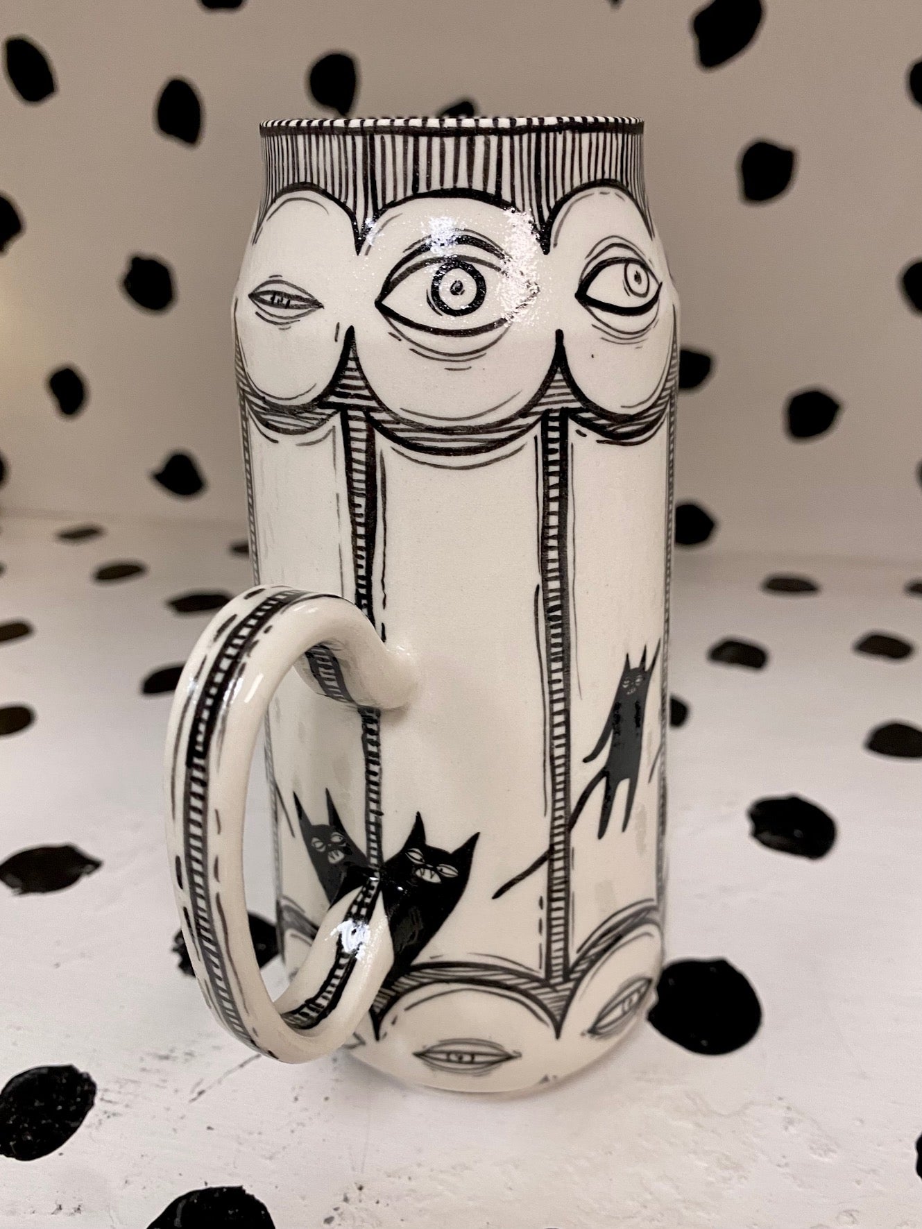 Handmade and hand painted porcelain ceramic mug. Electric fired to cone 6, about 6.5'' tall x 3.25'' wide, holds about 16 ounces. Microwave and dishwasher safe but hand washing is recommended for longevity of use.