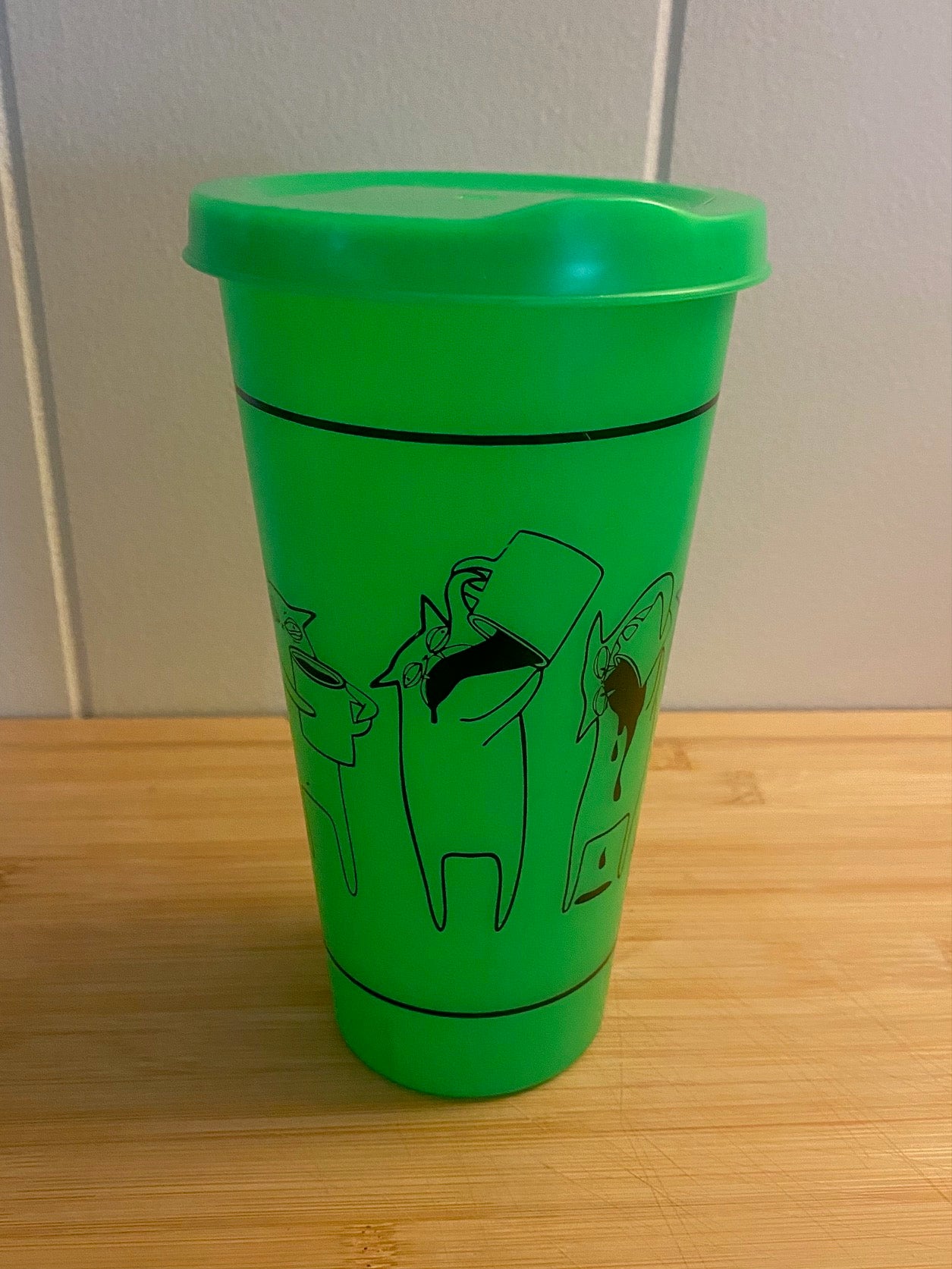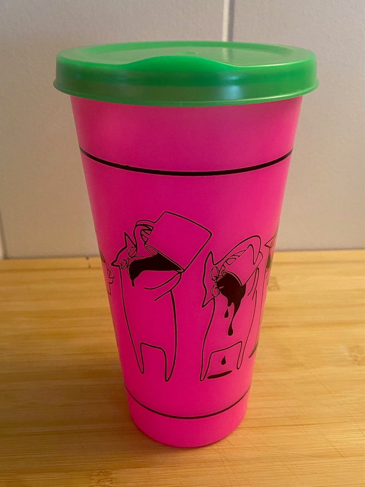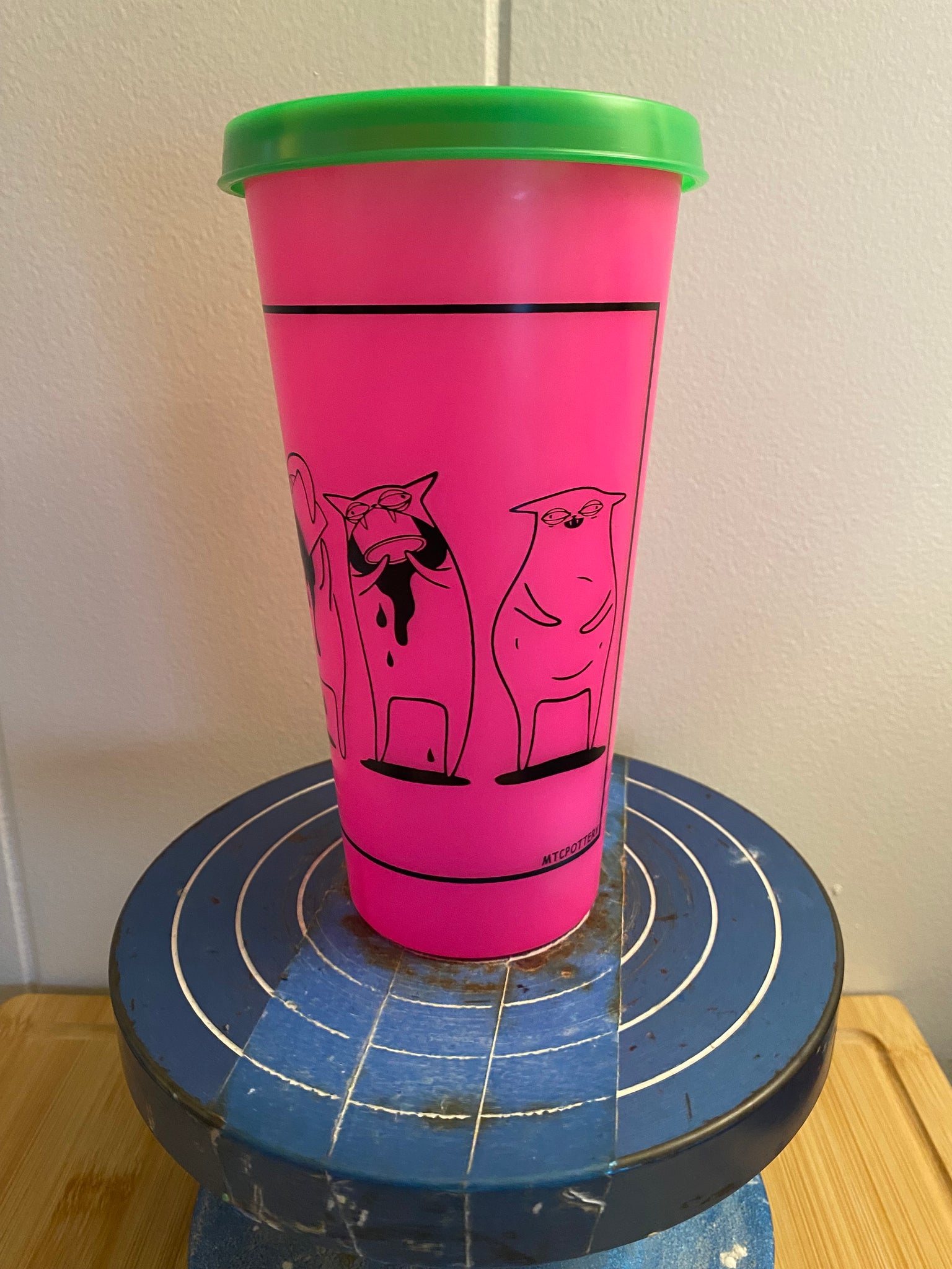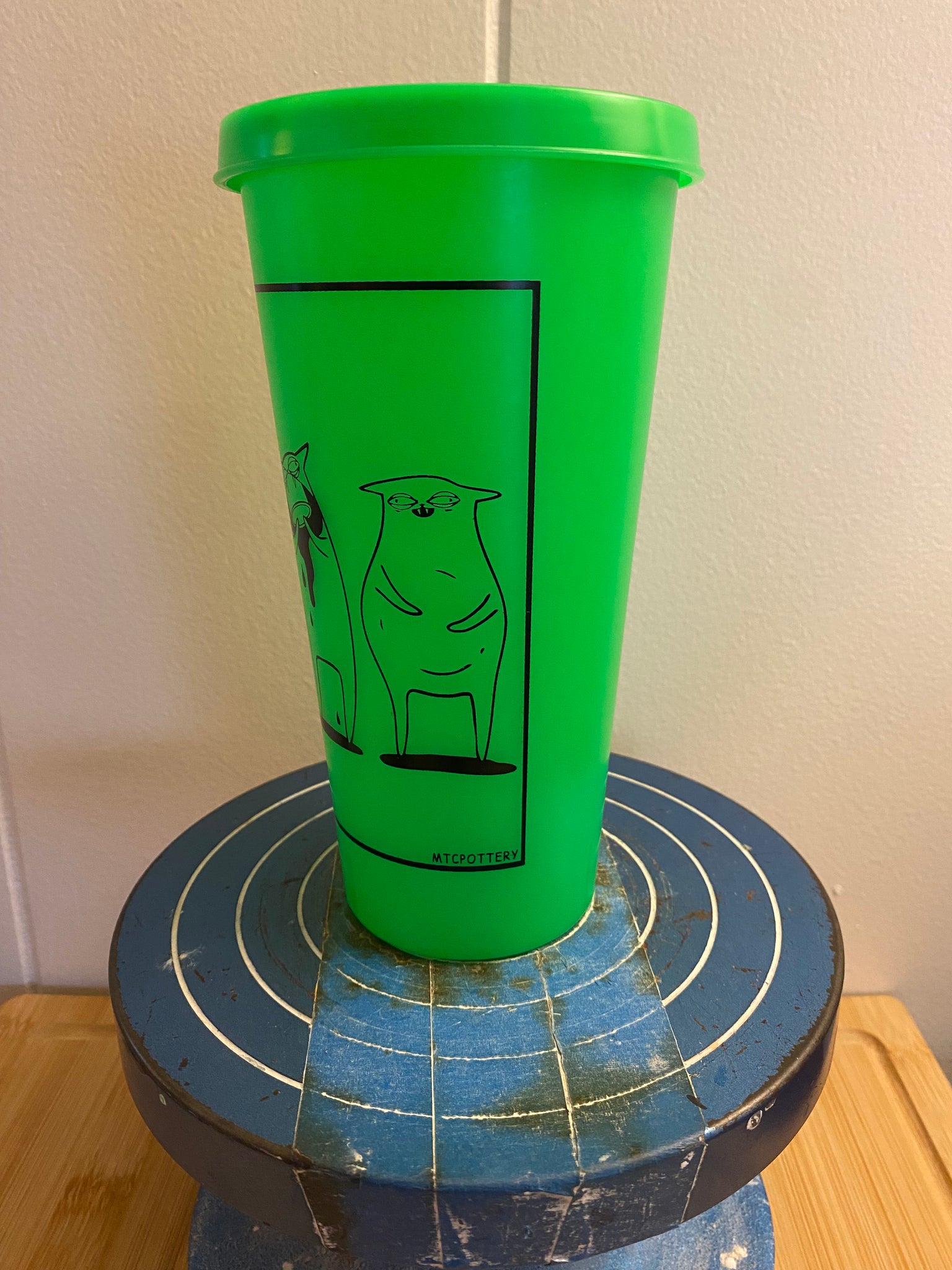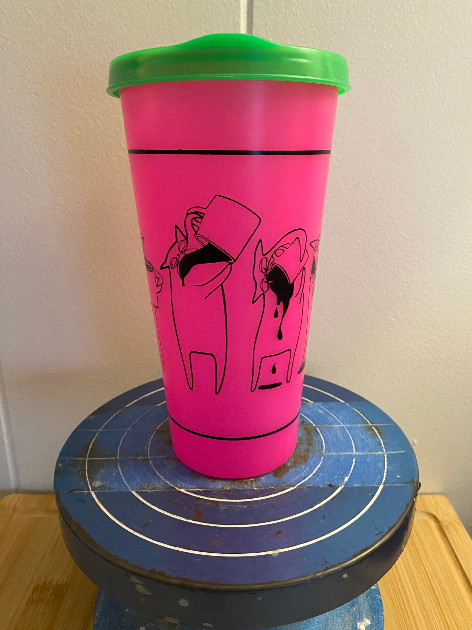 26 ounce bpa free plastic tumbler with snap on lid. Intended for use with cold beverages only. Hand washing recommended but I tested these in my dishwasher and at least with light use they seem to stand up well to the heat :)