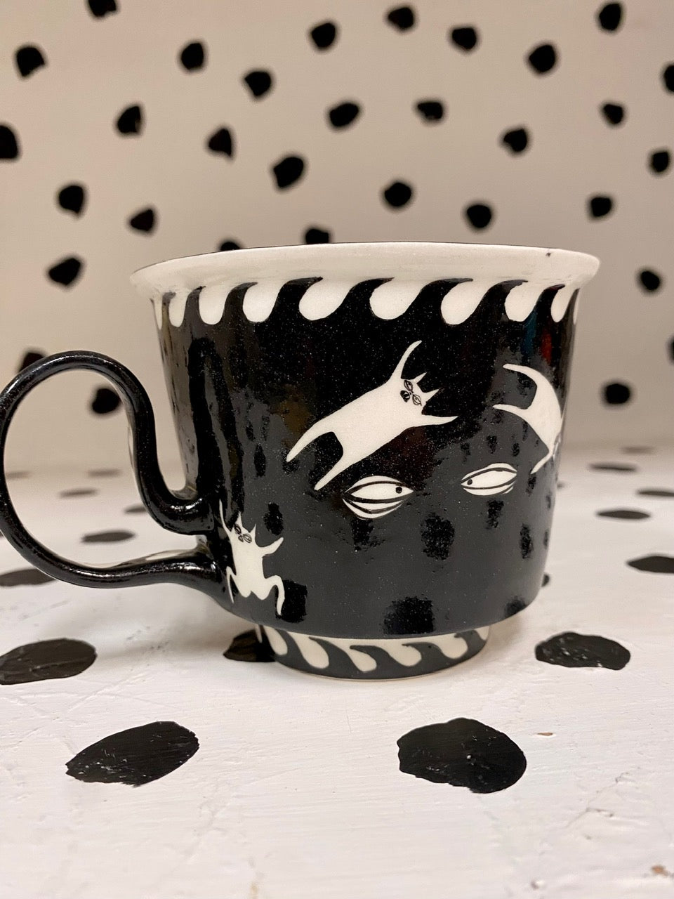 Handmade and hand painted porcelain ceramic mug. Electric fired to cone 6, about 5'' tall x 3.25'' wide, holds about 12 ounces. This piece is microwave and dishwasher safe but hand washing is recommended.