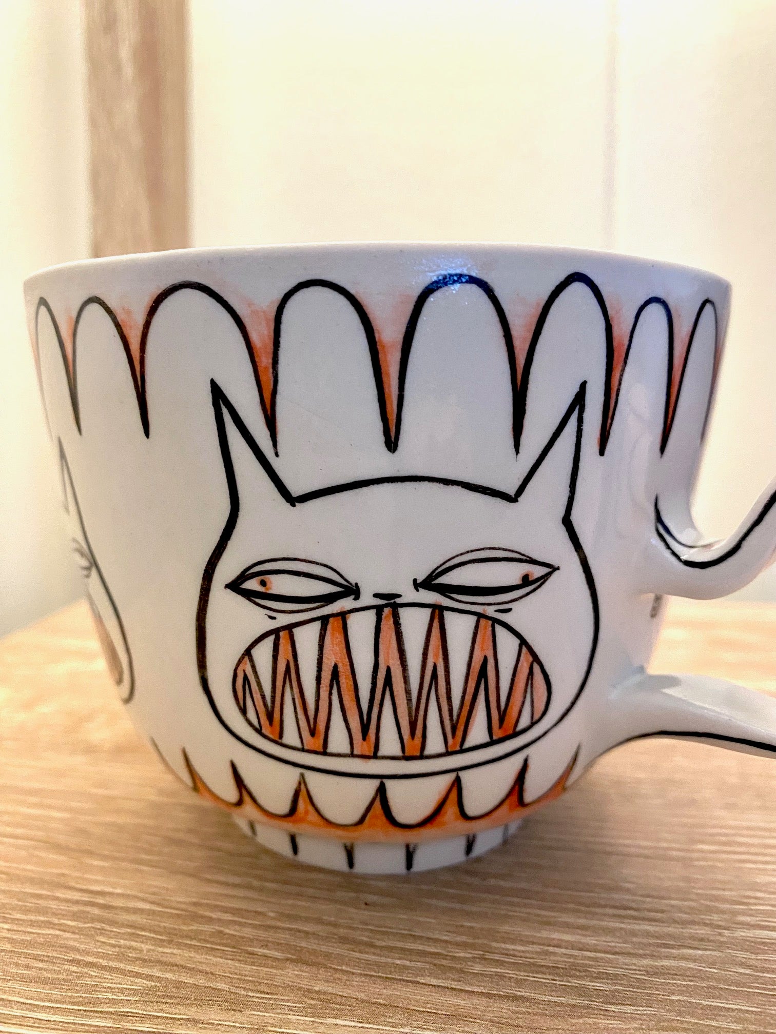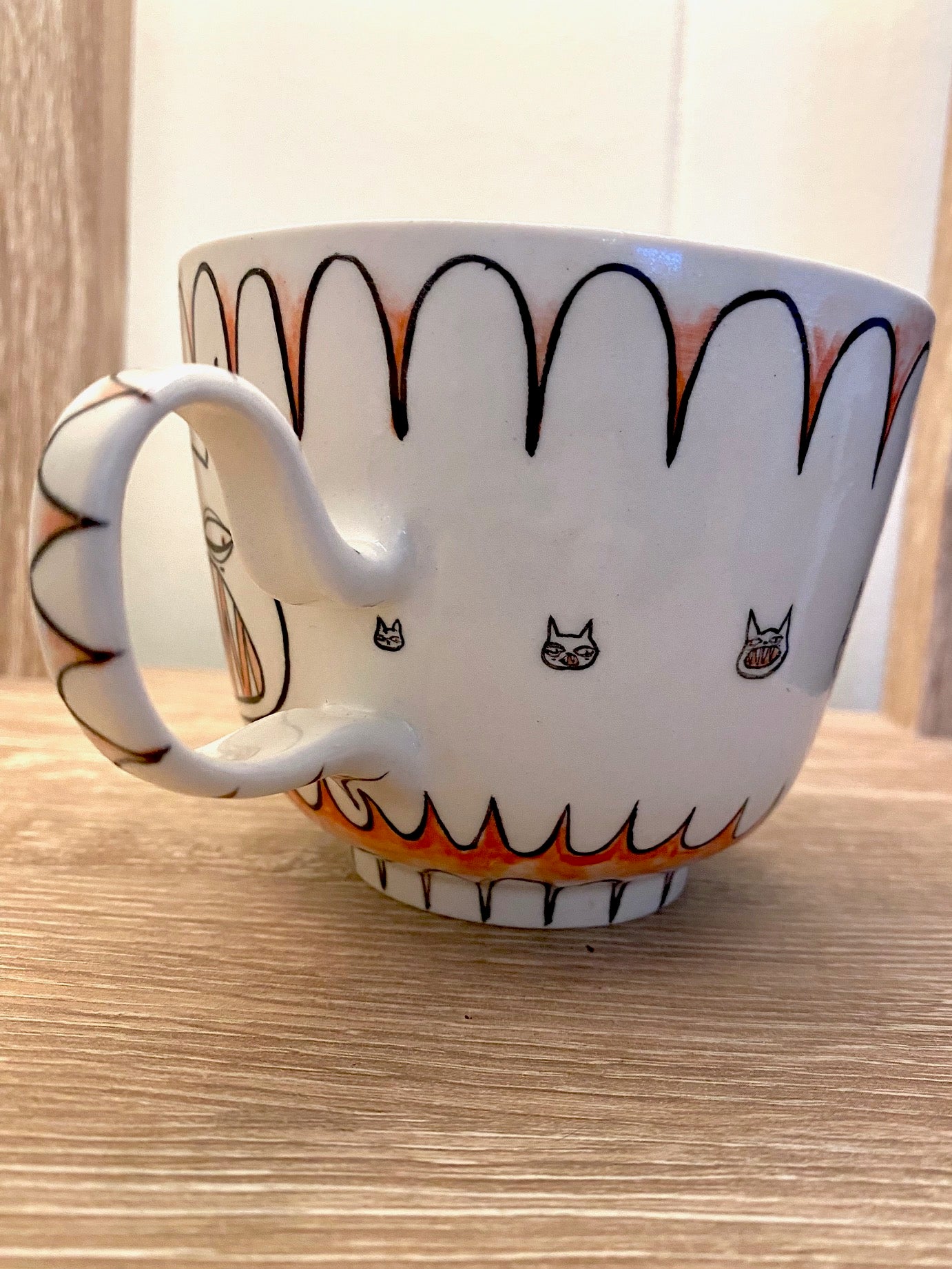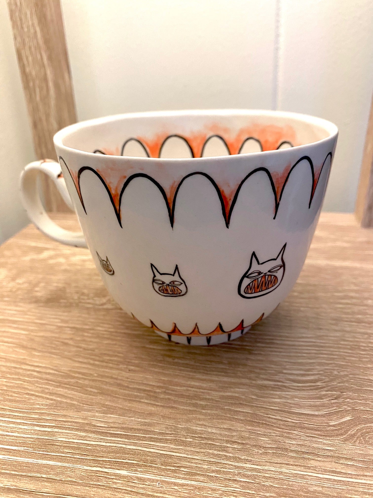 Handmade and hand painted porcelain ceramic mug. Electric fired to cone 6, about 4.5'' tall x 3.25'' wide, holds about 15 ounces. Dishwasher and microwave safe.