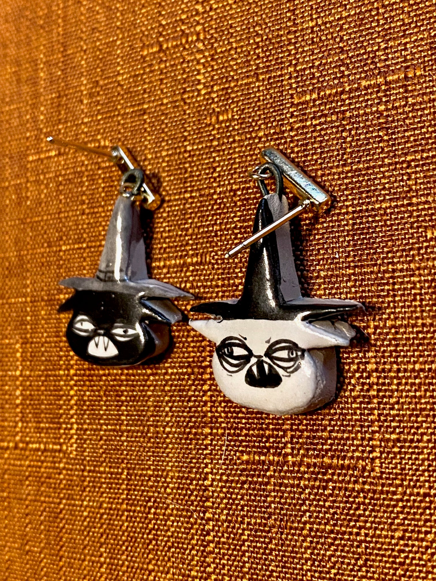 • Load image into Gallery viewer, Black and White Cat Witch Earrings